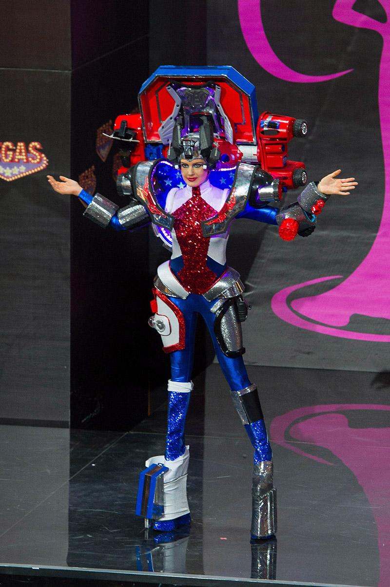 ส่วนชุดประจำชาติที่โดดเด่นสะดุดตาในแง่ความคิดสร้างสรรค์ต้องยกให้ชุดประจำชาติของ มิสยูเอสเอ “เอรีน เบรดี้” แปลงร่างเป็นหุ่นยนต์ทรานสฟอร์เมอร์สุดเซ็กซี่ พร้อมทำหน้าที่ “ตำรวจโลก” ออกปฏิบัติการกวาดล้างอาชญากรโลก.
