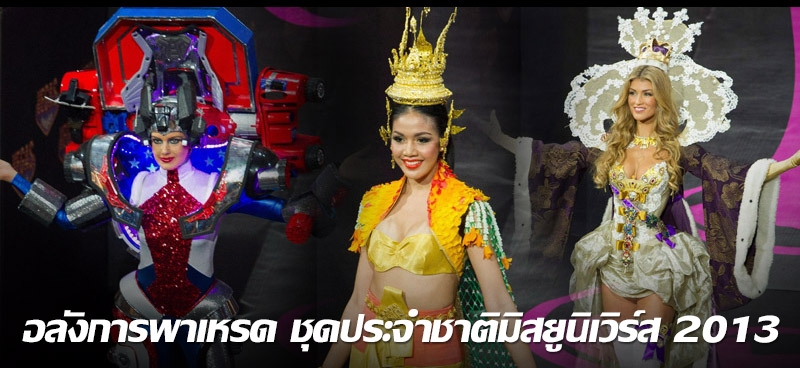 ลืมแฟชั่นวีคใหญ่ๆระดับโลกไปได้เลย เมื่อเจอกับความอลังการของพาเหรดแฟชั่นชุดประจำชาติจากเหล่าสาวงามทั่วโลก ที่เดินทางไปประชันขาอ่อนบนเวทีประกวดมิสยูนิเวิร์ส 2013 ณ กรุงมอสโก ประเทศรัสเซีย เพื่อชิงมงกุฎผู้หญิงสวยที่สุดในจักรวาล ซึ่งจะทราบผลในค่ำวันที่ 9 พ.ย.นี้ (ตามเวลาท้องถิ่น) โดยโค้งแรกประเดิมความคึกคักด้วยการขึ้นเวทีอวดความงดงามตระการตาของชุดประจำชาติ เพื่อเฟ้นหาสาวงามที่แต่งกายได้สวยงามมีเอกลักษณ์ของชาติมากที่สุด