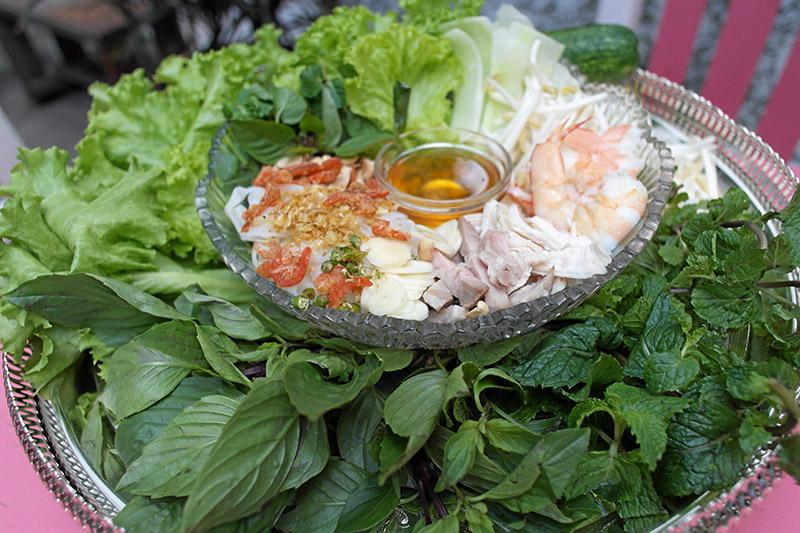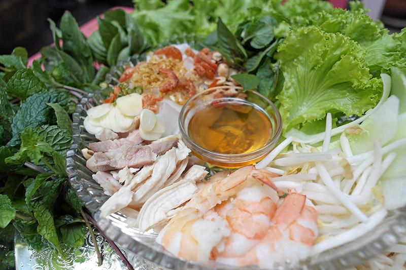 เครื่องปรุง : เส้นก๋วยเตี๋ยว (เส้นใหญ่)/เนื้อไก่ต้มฉีก/เนื้อหมู ต้มฉีก/กุ้งชีแฮ้หรือกุ้งกุลาลวกหั่นบาง/ผักกาดหอม/แตงร้าน/ถั่วงอก/ สะระแหน่/โหระพา/กุ้งแห้ง/ถั่วลิสงคั่ว/กระ-เทียมเจียว