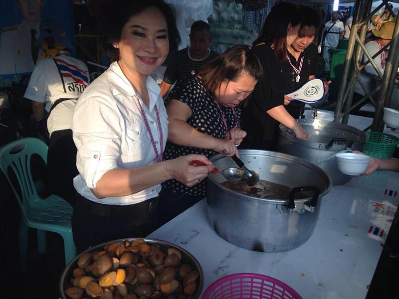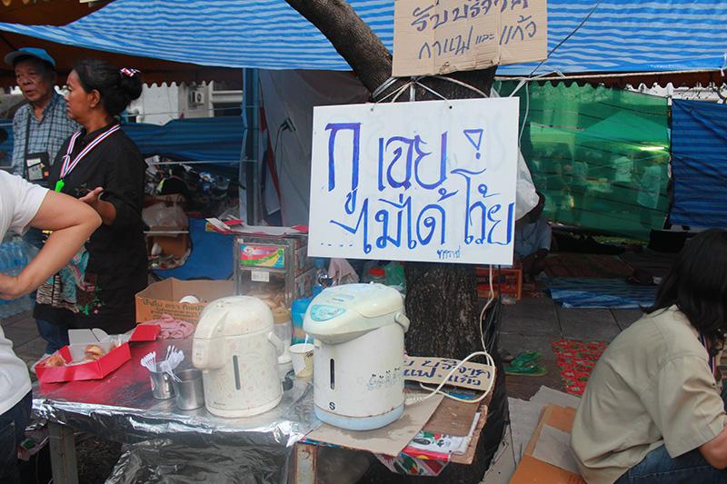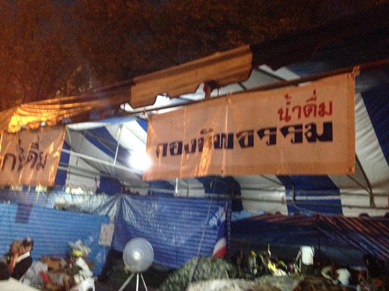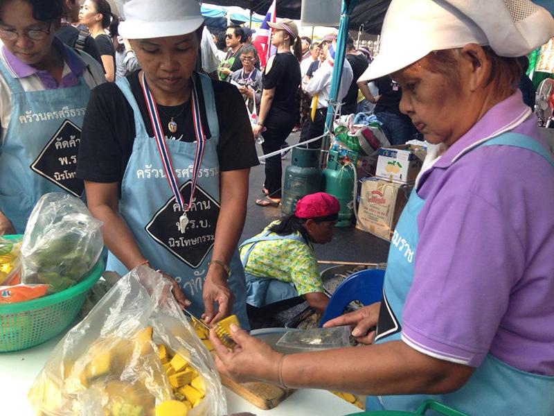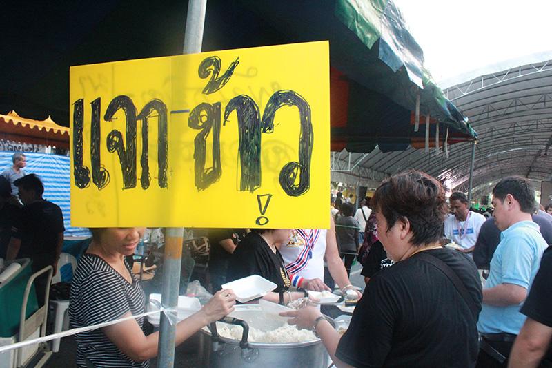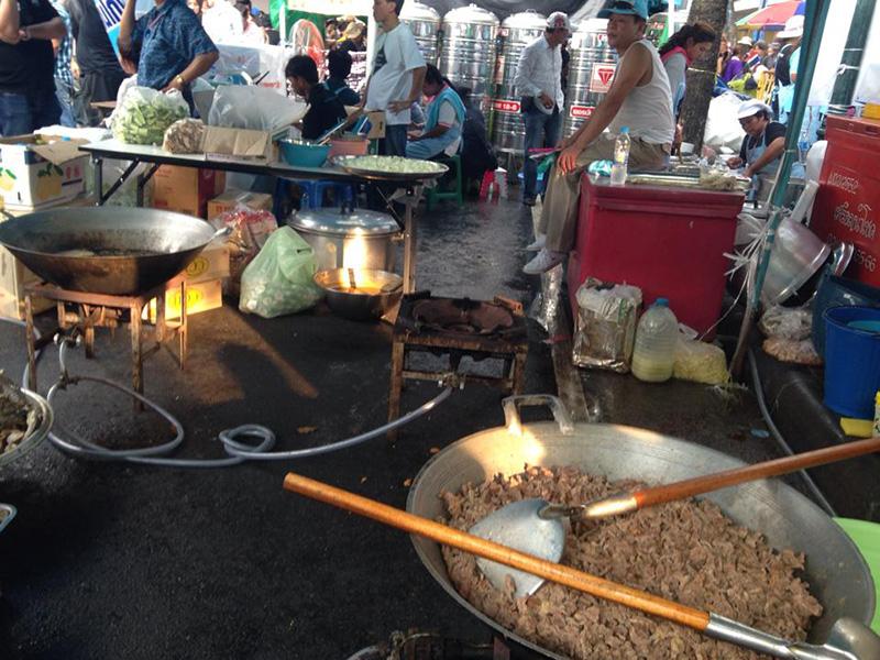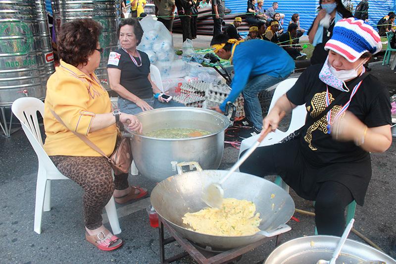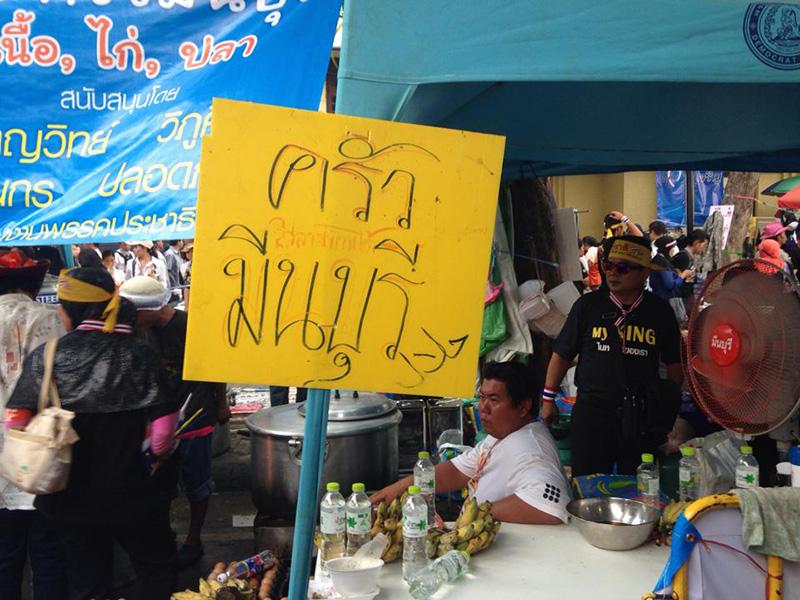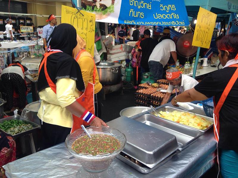 'ครัวประชาธิปัตย์' จากเวทีราชดำเนิน ครัวที่นี่จะมีร้านอาหารประมาณสี่สิบกว่าเกือบห้าสิบร้าน ส่วนใหญ่เป็นอาหารจากทางใต้ จะมีจำพวกก๋วยเตี๋ยวเยอะ ไม่ว่าจะเป็น เกี๋ยวเตี๋ยวน้ำใส กระเพาะปลา มาจากทั่วประเทศ จากกรุงเทพฯ ก็มีจะมีพวกก๋วยเตี๋ยว ส่วนข้าวแกงจะมาจากทางใต้ ทางอีสานก็มีผัดหมี่โคราช ทุกๆ วันมีการสับเปลี่ยนอาหาร โดยเฉพาะครัวข้าวแกงจะมีการเปลี่ยนเมนูทุกวัน หลักๆ เป็นพะแนงไก่ แกงไก่ ไก่ทอด และดึกๆ เป็นข้าวไข่เจียว ทุกครัวทุกร้านเน้นที่มีความสะอาดเป็นหลัก ในทุกๆ วันมีการเก็บกวาดร้านให้เป็นระเบียบเรียบร้อย นอกจากนี้ยังมีร้านอิสลามอยู่คอยบริการชาวอิสลามประมาณ 3 ร้าน มีร้านข้าวเหนียวหมูจากเมืองกาญจน์ ใช้หมูประมาณวันละ 200 กิโล ส่วนเรื่องรสชาติของความอร่อย