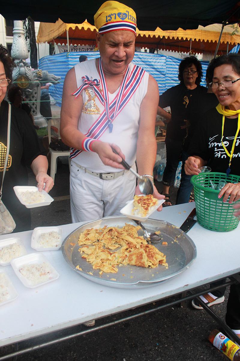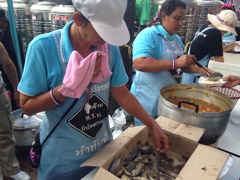 ส่วนแม่ครัวจาก 'ครัวกองทัพธรรม' กองทัพประชาชนโค่นระบอบทักษิณ (กปท.) ที่เวทีผ่านฟ้า กองทัพประชาชนฯและกองทัพธรรม บอกว่า ครัวนี้มีจุดเด่นที่เป็นอาหารมังสวิรัติ เน้นพวกผักไร้สารเราจะส่งมาทุกวันวันจันทร์ อังคาร ศุกร์ เสาร์ เราจะส่งผักมาเป็นผักไร้สารมาตรงนี้ พันธมิตรก็จะเอามาบริจาคเราก็มีแต่เราก็ต้องล้างใช้แช่ 15 นาที ทุกวันอาหารจะไม่ซ้ำมีอาหารให้ตั้งแต่เช้า 8 โมงครึ่ง จนบ่ายเราจะพักและจะมีมาเปลี่ยนกะกันตอนบ่ายสามโมงจนกระทั่งเลิกการชุมนุม จนกว่าอาหารจะหมดเลิกประมาณสามทุ่ม เน้นพวกโปรตีน ไม่มีเนื้อสัตว์ ถ้าเป็นร้านอื่นก็จะเป็นแบบมีคนมาบริจาคเอง มาทำกันเอง มีประมาณ 3-4 ร้าน มีข้าวผัดบ้าง ก๋วยเตี๋ยวหมู ข้าวมันไก่บ้าง ส่วนอาหารมังสวิรัติมีคนมากินเยอะมากหมดทุกวันไม่มีเหลือ