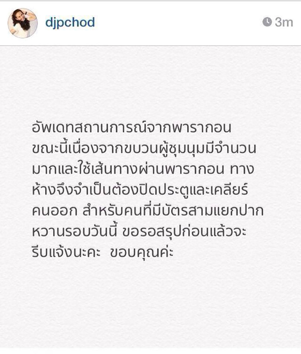 นายศกร ทวีสิน ผู้ช่วยผู้อำนวยการฝ่ายการตลาด บริษัท เซ็นทรัลพัฒนา จำกัด (มหาชน) และ ฝ่ายประชาสัมพันธ์ของสยามพารากอนออกมากล่าวผ่านไทยรัฐออนไลน์ว่า ตอนนี้ห้างสรรพสินค้าเปิดให้เข้าไปใช้บริการกันตามปกติ ซึ่งทางผู้บริหารคอยจับตา และรอประเมินสถานการณ์ทางการเมืองเป็นระยะๆ รายวัน โดยผู้บริหารได้จับตาอย่างใกล้ชิดหากเกิดเหตุอะไรขึ้นทางห้างจะปิดทำการทันที