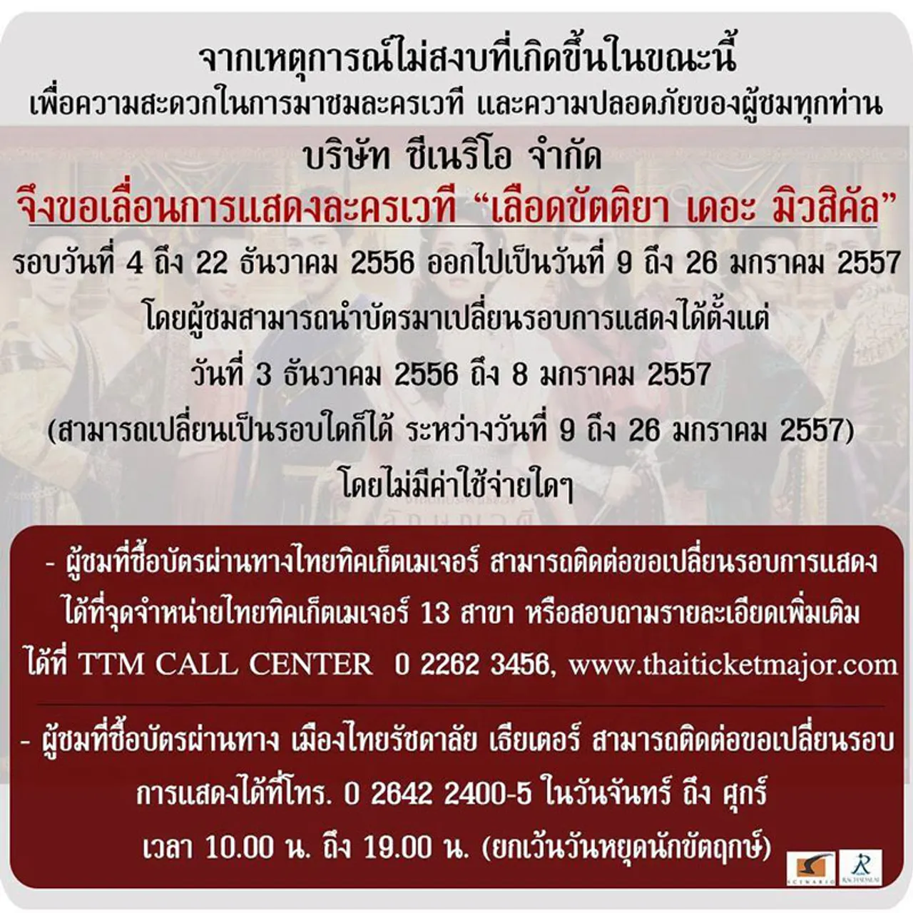 ขณะที่ บริษัท ซีเนริโอ จำกัด ได้ออกมาโพสต์ภาพประกอบข้อความทางเฟซบุ๊ก ขอประกาศเลื่อนรอบการแสดงละครเวที "เลือดขัตติยา เดอะ มิวสิเคิล" ของเดือนธันวาคม โดยมีรายละเอียดดังนี้