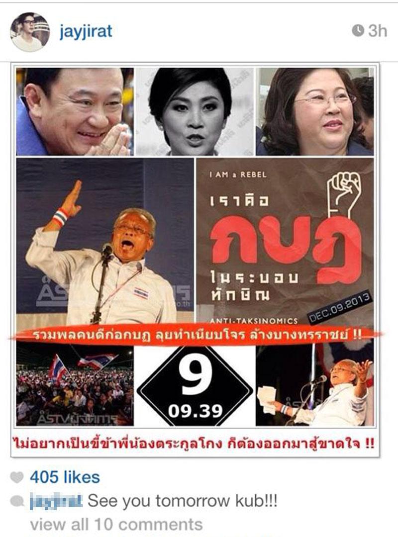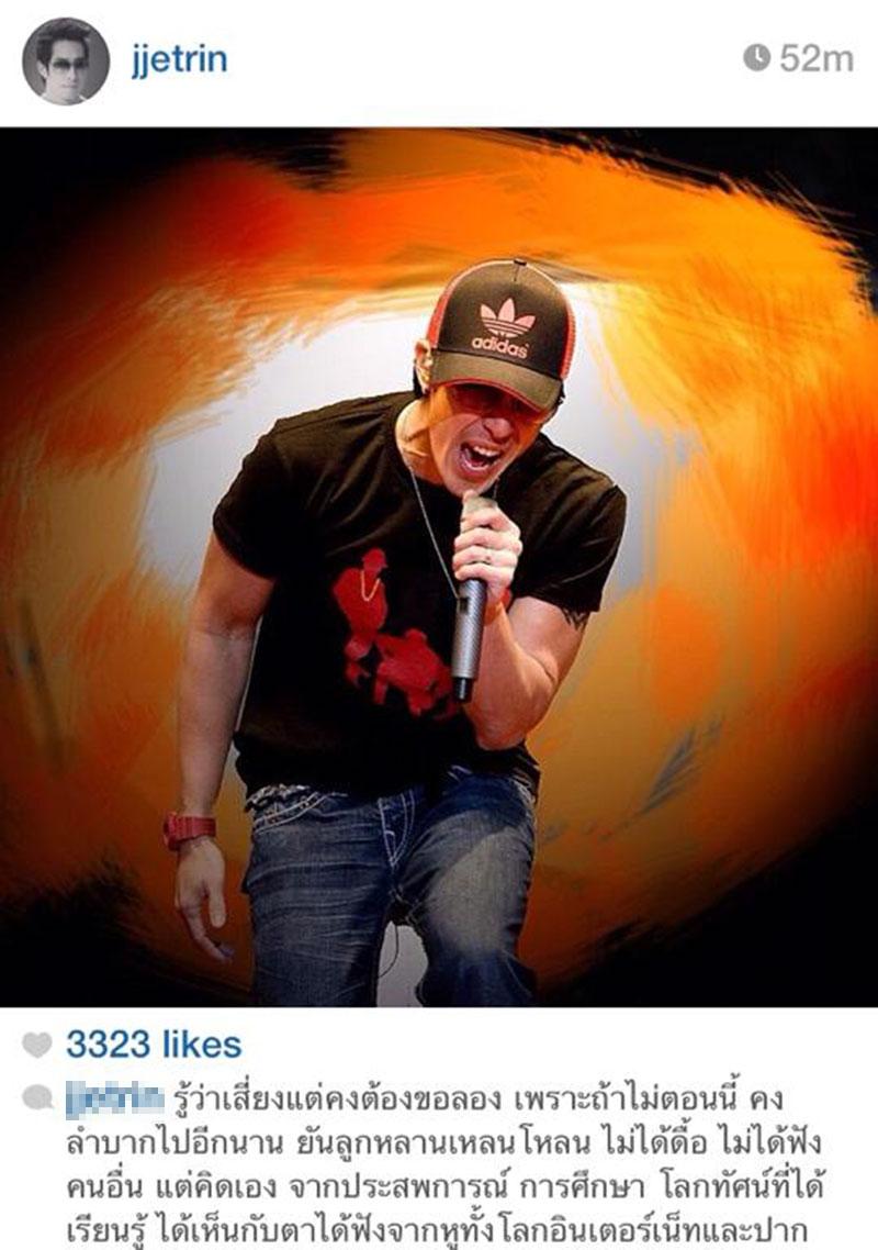 นักร้องชื่อดังหนุ่มเจ เจตริน ได้โพสต์รูปพร้อมข้อความเด็ดๆ ว่า รู้ว่าเสี่ยงแต่คงต้องขอลอง เพราะถ้าไม่ตอนนี้ คงลำบากไปอีกนาน ยันลูกหลานเหลนโหลน ไม่ได้ดื้อ ไม่ได้ฟังคนอื่น แต่คิดเอง จากประสบการณ์ การศึกษา โลกทัศน์ที่ได้เรียนรู้ ได้เห็นกับตาได้ฟังจากหูทั้งโลกอินเทอร์เน็ตและปากมนุษย์ ประวัติศาสตร์ของชาติเรา หรือ แม้แต่ชาติอื่นมันก็สอนได้ด้วย ชาติไทยเลิกทาสไปตั้งแต่สมัยเสด็จพ่อรัชกาลที่ 5 และไม่มีสิทธิ์ที่จะมาแบ่งชนชั้นรวยจน ประชาชนเท่ากันรักกันมานาน เสียดายถ้าจะให้ไทยแตกระแหงเพราะการปลุกสะดม ผมจะเสี่ยงดีกว่ามองมันผุกร่อนโดยไม่ได้ทำห่าอะไรเลย "เกิดมาชาติเดียวไม่ทำเพื่อชาติมันก็คือเสียชาติเกิด" เพื่อชาติ ศาสน์ กษัตริย์ ใครจะมาเกรียนหยาบ ก็แค่บล็อก ส่วนสื่อกากอื่นๆ บอกเลยผมไม่เคยเสพเลย เพราะมันคือกากที่อยู่ตรงนั้น จะโกรธเพราะไม่รับฟังผม ผมก็ไม่ว่าอะไร มันเป็นสิทธิ์ส่วนตัว แต่วอนให้ใช้สติปัญญาและสมองไตร่ตรองช้าๆ แบบไม่มีอคติ ปล.ผมขอบอกอีกครั้งว่า มันไม่เท่ ไม่เคยชอบทำอะไรแบบนี้ ไม่ต้องโปรโมต ไม่ได้ออกซิงเกิ้ล ไม่ได้เล่นละคร ดังมาจนจะแขวนนวมละ ไม่ได้ชอบเรื่องการเมือง แต่ที่ต้องออกมาเพราะมันไม่ใช่เรื่องส่วนตัว แต่มันคือเรื่องของอนาคตประเทศไทย.