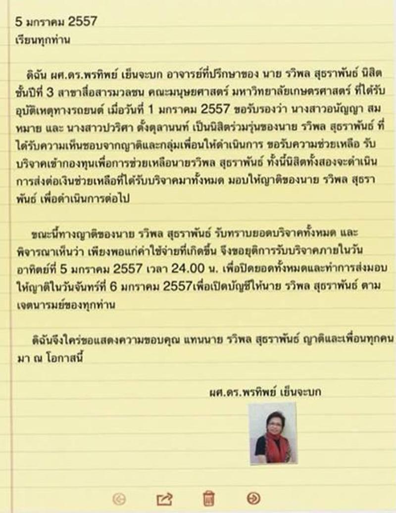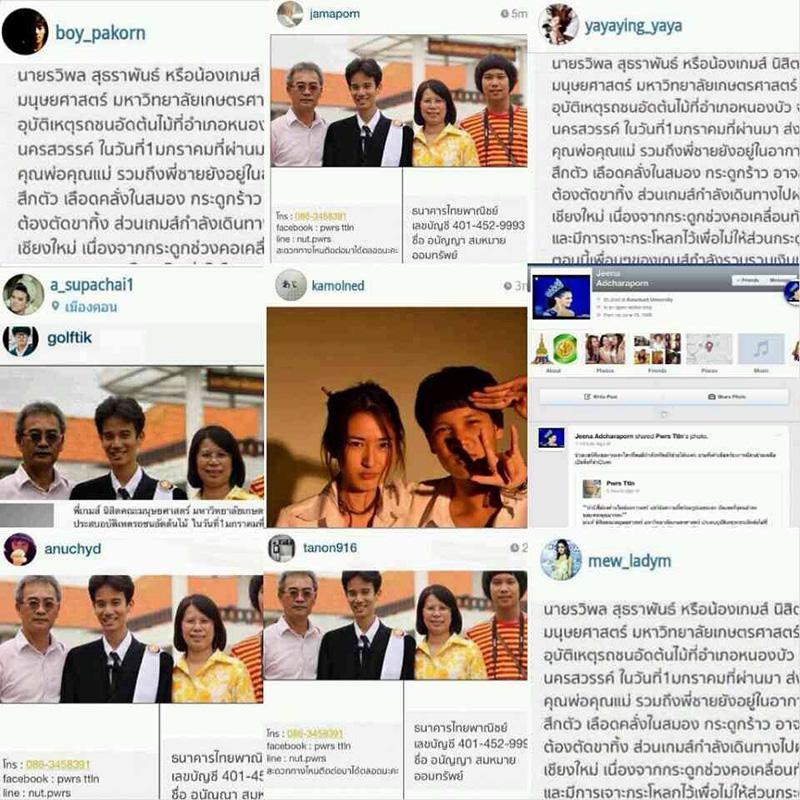 กลายเป็นประเด็นร้อนในโลกโซเชียลอีกครั้ง หลังมีการโพสต์เรื่องราวขอความช่วยเหลือ "เกมส์" หรือ นายรวิพล สุธราพันธ์ อายุ 20 ปี นิสิตคณะมนุษยศาสตร์ ม. เกษตรศาสตร์ที่ประสบอุบัติเหตุจากรถยนต์ ส่งผลให้พ่อและแม่เสียชีวิตทันที ส่วนพี่ชาย ก็ได้รับบาดเจ็บอาการสาหัสเมื่อวันที่ 1 ม.ค.57