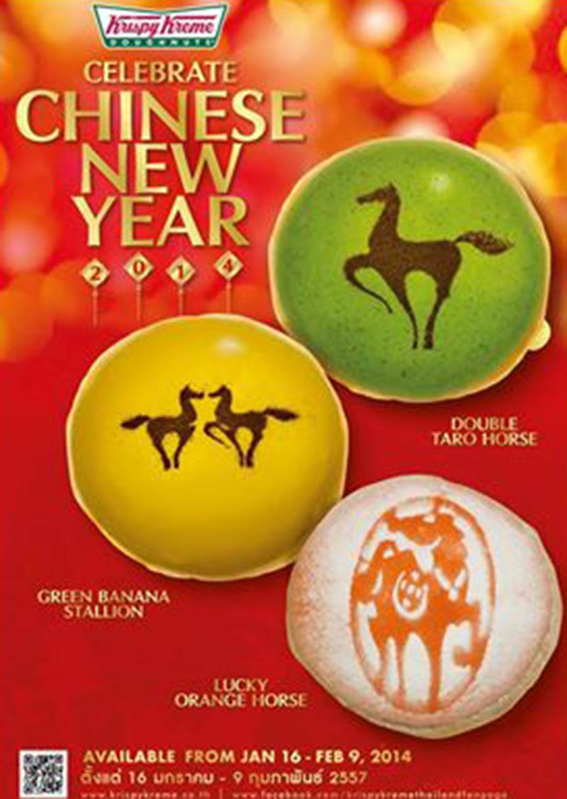 คริสปี้ ครีม ไชนีส นิวเยียร์ โดนัท 3 หน้า 3 รส 3 ลวดลาย สุดพิเศษ ที่สอดแทรกความหมายดีๆ จากใจผู้ให้ถึงผู้รับ ให้ทุกคนได้สุข สนุก โชคดีกันตลอดปีมะเมีย ด้วยโดนัทรูปม้าสุดเก๋ แสนสง่า กับ คริสปี้ ครีม กรีน บานาน่า สตาเลี่ยน โดนัทรสกล้วย ที่มีความหมายเพื่อขอให้ชีวิตราบรื่น, คริสปี้ ครีม ลัคกี้ ออเรนจ์ ฮอร์ส โดนัทรสส้ม เพื่อความอุดมสมบูรณ์ มั่งคั่ง และ คริสปี้ ครีม ดับเบิ้ล ทาโร่ ฮอร์ส ที่สอดไส้เผือก ให้ความหมายถึง การมีชีวิตครบถ้วน สมบูรณ์พูนสุขตลอดปี ตลอดไป ตั้งแต่วันที่ 16 มกราคม - 9 กุมภาพันธ์ 2557