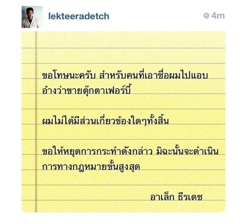 หลังจากนั้น อาเล็ก ธีรเดช พระเอกชื่อดังได้ออกมาให้สัมภาษณ์กรณีถูกแอบอ้างชื่อในการจำหน่ายตุ๊กตาเฟอร์บี้ว่า ขอยืนยันความบริสุทธิ์ใจ ไม่มีส่วนรู้เห็นแต่อย่างใด หลังจากที่รู้ว่าโดนแอบอ้างชื่อ เมื่อคืนจึงตัดสินใจโพสต์ข้อความผ่านอินสตาแกรมส่วนตัวว่า ไม่มีส่วนเกี่ยวข้องใดๆ ทั้งสิ้น ส่วนตัวก็ไม่ได้สนใจตุ๊กตาเฟอร์บี้อยู่แล้ว แค่รู้ว่ามีตัวตุ๊กตาตัวนี้ รู้จักว่าหน้าตาเป็นอย่างไร แต่ไม่ได้เล่น เป็นผู้ชายจะให้มาเล่นตุ๊กตาแนวนี้จะดูกุ๊กกิ๊กไป หากเป็นหุ่นยนต์ก็ว่าไปอย่าง ส่วนจะแจ้งความดำเนินคดีผู้ที่แอบอ้างชื่อนั้น คงปล่อยให้ผู้เสียหายที่โดนโกงไปแจ้งความดำเนินคดี ตนได้แต่สงสาร เห็นใจผู้เสียหาย และหลังจากมีเหตุการณ์ไม่ได้ถูกใครต่อว่า เพราะหลายๆ คนรู้ว่าตนโดนแอบอ้าง สิ่งที่ตนโพสต์เพราะไม่อยากให้แฟนคลับเข้าใจผิด และทุกคนเข้าใจ เป็นครั้งแรกที่เจอเรื่องราวอะไรแบบนี้ คาดว่าคงเป็นปีชงด้วยหรือเปล่าจึงทำให้เจอเรื่องแบบนี้