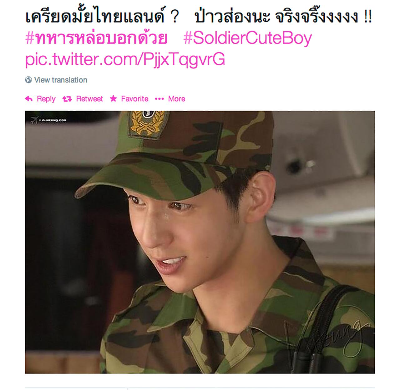 ไทยรัฐออนไลน์ ขอเกาะกระแส 'กฎอัยการศึก' จากตอนที่ 1 โดยได้รวบรวมภาพจากแฮชแท็กที่กำลังขึ้นเทรนด์ฮิตอยู่บนทวิตเตอร์ตอนนี้ นั่นคือ #ทหารหล่อบอกด้วย และ #SoldierCuteboy (http://www.thairath.co.th/content/424030) แค่ตอนที่ 1 ก็ทำให้สาวๆ ฟินกันทั่วบ้านทั่วเมือง เพราะฉะนั้นไม่รอช้าพาไปฟินกับ 'ทหารหล่อบอกด้วย' ตอนที่ 2 ซึ่งเรารับรองว่าตอนนี้สาวๆ ทั้งหลายจะฟินยิ่งกว่าเดิมเพราะมีคนดังมาร่วมอยู่ในแฮชแท็กนี้ด้วย จะหล่อแซ่บมาดแมนบึกบึนสมชายชาติทหารแค่ไหน ไปชมกันได้เลย!!