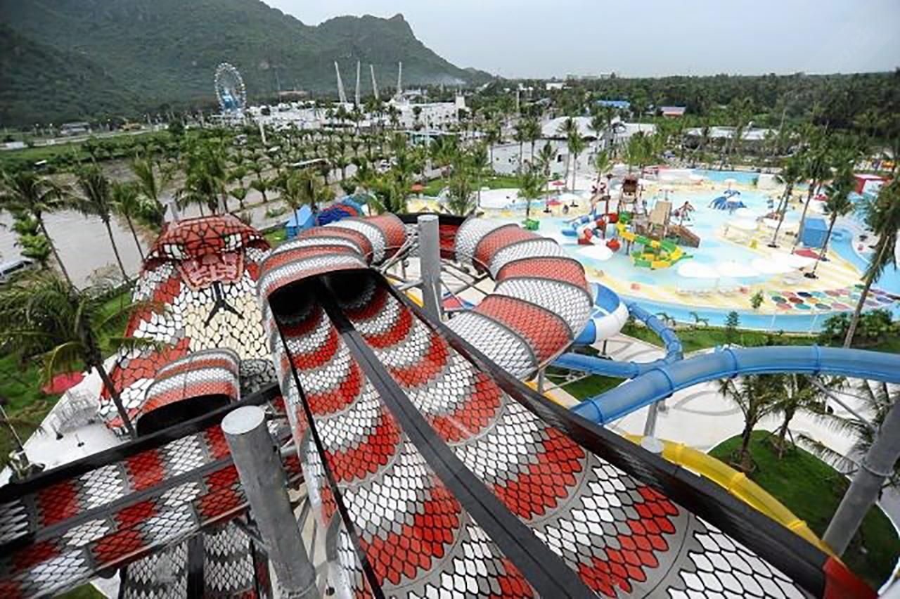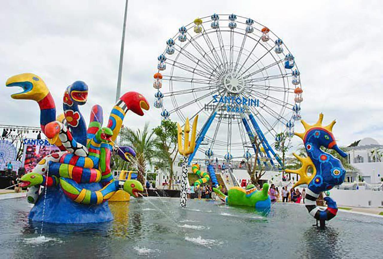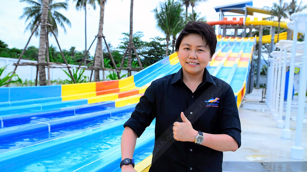 เมื่อมาทำในส่วนของพรีเมี่ยมเอาท์เล็ต วี บอกว่า ทำให้มองเห็นช่องทางการต่อยอดธุรกิจอื่นออกไปอีก “จากการดูตัวเลขปริมาณการจราจรบนถนนที่จะไปชะอำแล้ว ที่นี่โตขึ้นเรื่อยๆ ประมาณปี 2011 คุณพ่อจึงเริ่มซื้อที่เก็บสะสมมาเรื่อยๆ จนมีขนาดใหญ่ประมาณ 50 ไร่ ก็มานั่งคิดโปรเจกต์ว่า ควรทำอะไร จนเป็นที่มาของซานโตรินี่ พาร์ค และคุณพ่อก็ให้วีเข้าไปดูตั้งแต่แรก คืออยากทำรีเทล ที่ผสมกับทัวร์ริสสปอต เป็นเหมือนจุดท่องเที่ยวด้วย เราก็เลยเอาคำว่า “สนุก” เข้ามาเป็นโจทย์ให้ทุกมุมของซานโตรินี่พาร์คมีความสนุก มีทั้งเครื่องเล่น และร้านค้า สามารถถ่ายรูปได้ทุกจุด พอเปิดไปได้สักพักหนึ่งกระแสตอบรับดีมาก ปีแรกมีคนเข้ามาเที่ยวโครงการประมาณล้านคน คุณพ่อจึงบอก ลูกๆว่า น่าจะทำอะไรต่อ วีก็เสนอเลยว่า อยากทำธุรกิจเกี่ยวกับสวนน้ำ เพราะเมืองไทยอากาศร้อน เอื้อต่อการทำธุรกิจนี้มาก ขนาดต่างประเทศเปิดแค่เป็นซีซั่นเขายังทำเลย ในเมื่อเมืองไทยอากาศเอื้อให้เล่นน้ำได้ทั้งปี และยังไม่ค่อยมีใครทำธุรกิจสวนน้ำเท่าไร จึงเสนอคุณพ่อให้ทำสวนน้ำ คุณพ่อก็ให้เราไปศึกษาดูงาน และเรียกซัพพลายเออร์มานั่งคุยว่าจะเอาเครื่องเล่นตัวไหนบ้าง”