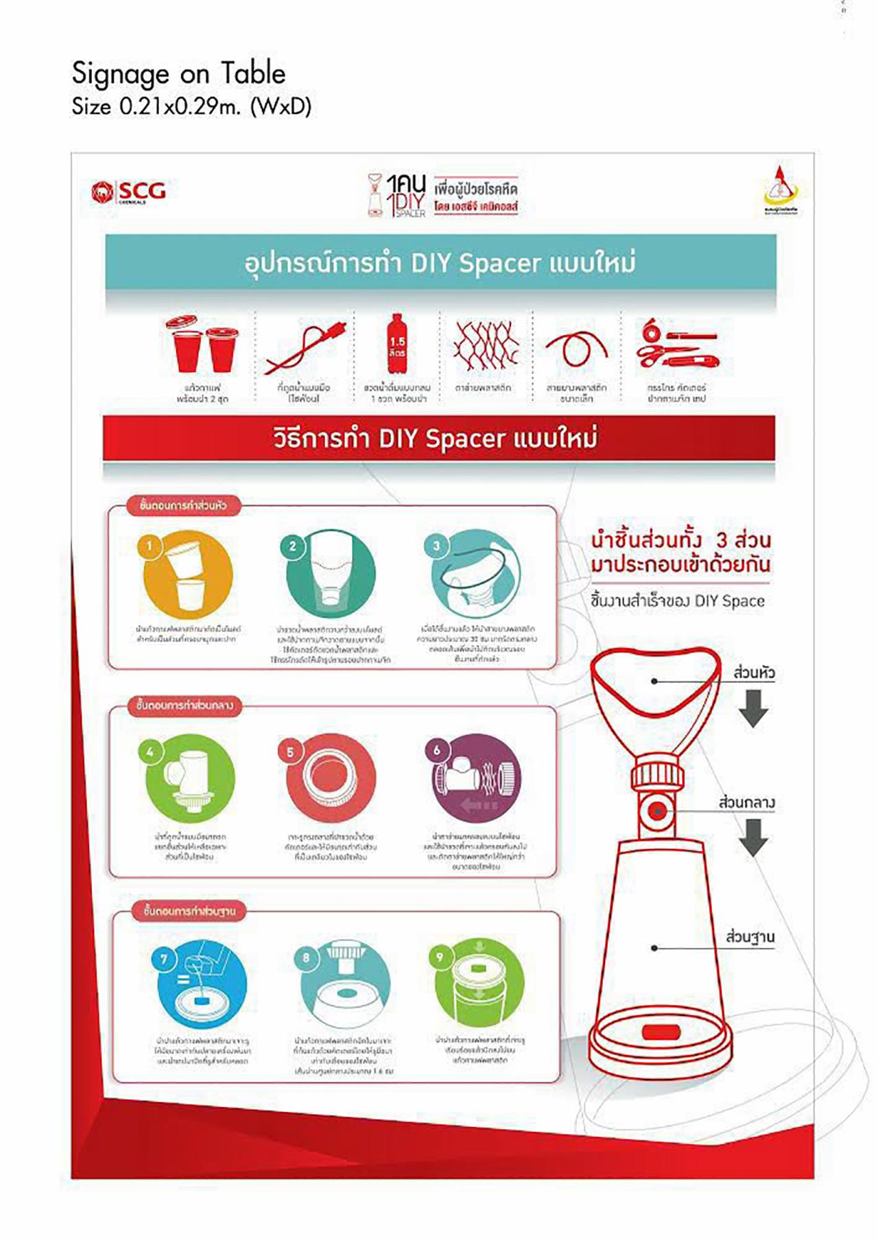 ผู้บริหารเอสซีจี เคมิคอลส์ “ชลณัฐ ญาณรณพ” กล่าวว่า จากที่เรามีความเชี่ยวชาญด้านนวัตกรรมพลาสติกและการออกแบบอุปกรณ์เพื่อการแพทย์ จึงนำความเชี่ยวชาญนี้มาใช้เพื่อช่วยเหลือสังคม ด้วยการจัดทำอุปกรณ์พ่นยาสำหรับผู้ป่วยโรคหืด ที่เรียกว่า DIY Spacer ที่ประกอบง่าย โดยเราได้พัฒนาดีไซน์ให้ใหม่ แต่ยังคงแนวคิดทำได้ด้วยตัวเอง โดยนำแก้วพลาสติกและฝาปิด ซึ่งหาได้ง่ายในท้องตลาด มาใช้เป็นส่วนกระบอกสำหรับกักเก็บยา และเปลี่ยนมาใช้ตาข่าย ที่ช่วยป้องกันสิ่งแปลกปลอมไม่ให้เข้าสู่ระบบทางเดินหายใจ แทนการเย็บด้วยด้ายไนลอน โดยใช้เวลาทำ 5-10 นาที ชิ้นงานนี้ได้รับการจดอนุสิทธิบัตรรับรอง ร่วมกันระหว่างเอสซีจี เคมิคอลส์ และมหาวิทยาลัยธรรมศาสตร์ เพื่อป้องกันการนำไปใช้ประโยชน์ในเชิงพาณิชย์ และรักษาสิทธิให้เกิดประโยชน์สูงสุดแก่สาธารณชน ซึ่งเราจะมุ่งเน้นถ่ายทอดองค์ความรู้ไปยังภาคต่างๆ เริ่มต้นที่จังหวัดระยอง ในปี 2558