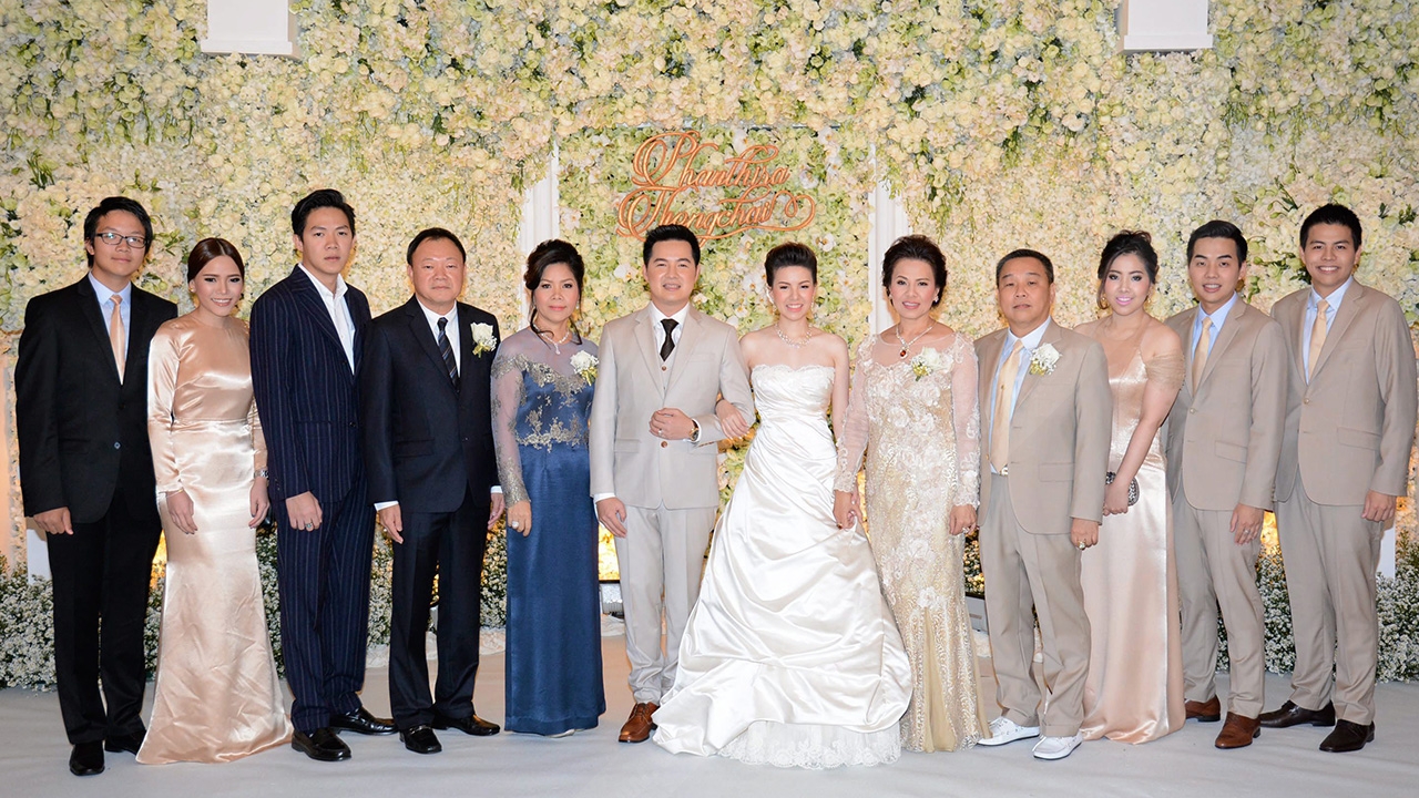 ครอบครัว “นิกร–ภคภรณ์ หงษ์ศรีสุข” และ “สถาพร–นิตยา วงศ์กิตติการ” ชื่นมื่นกับความรักของคู่บ่าวสาว.