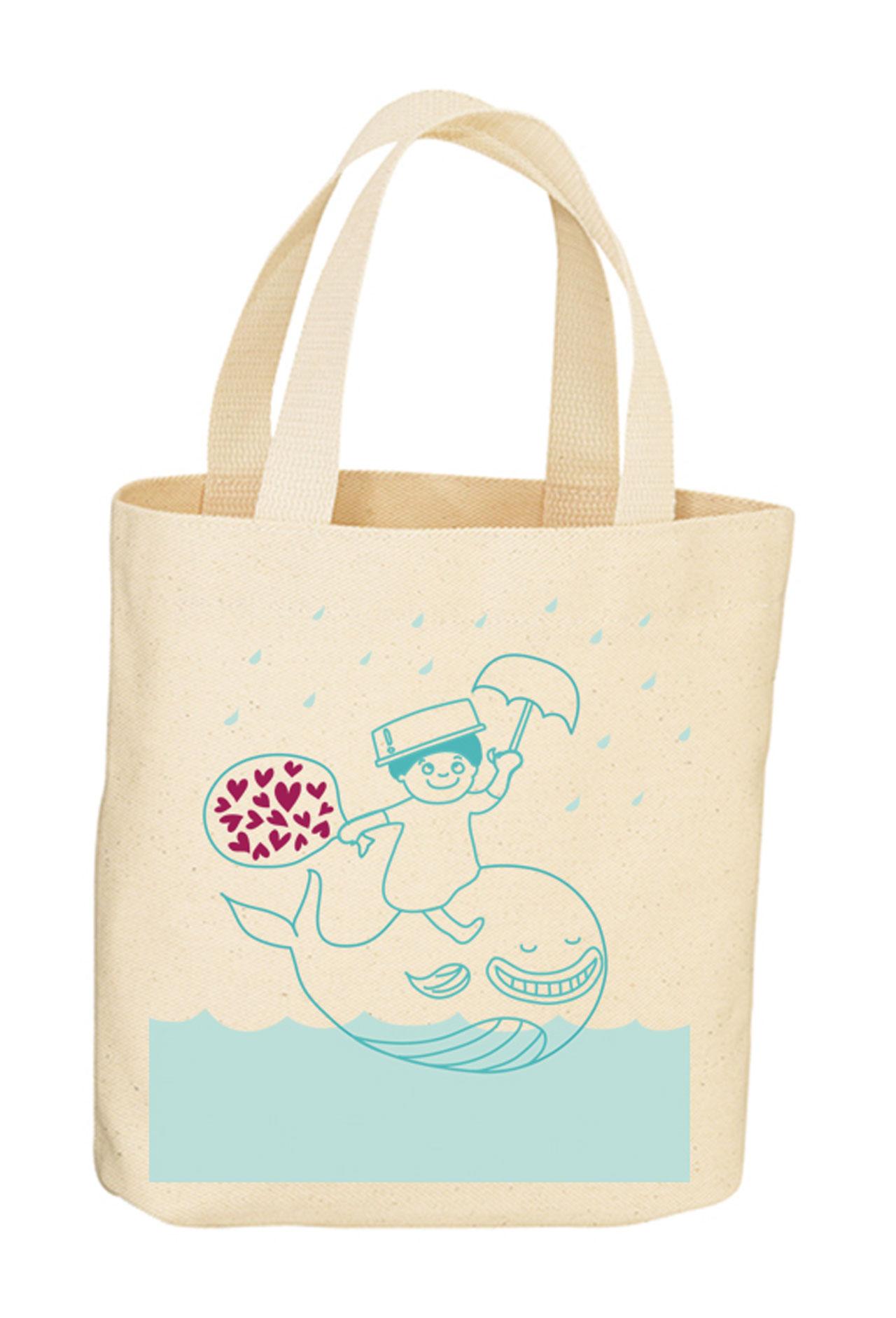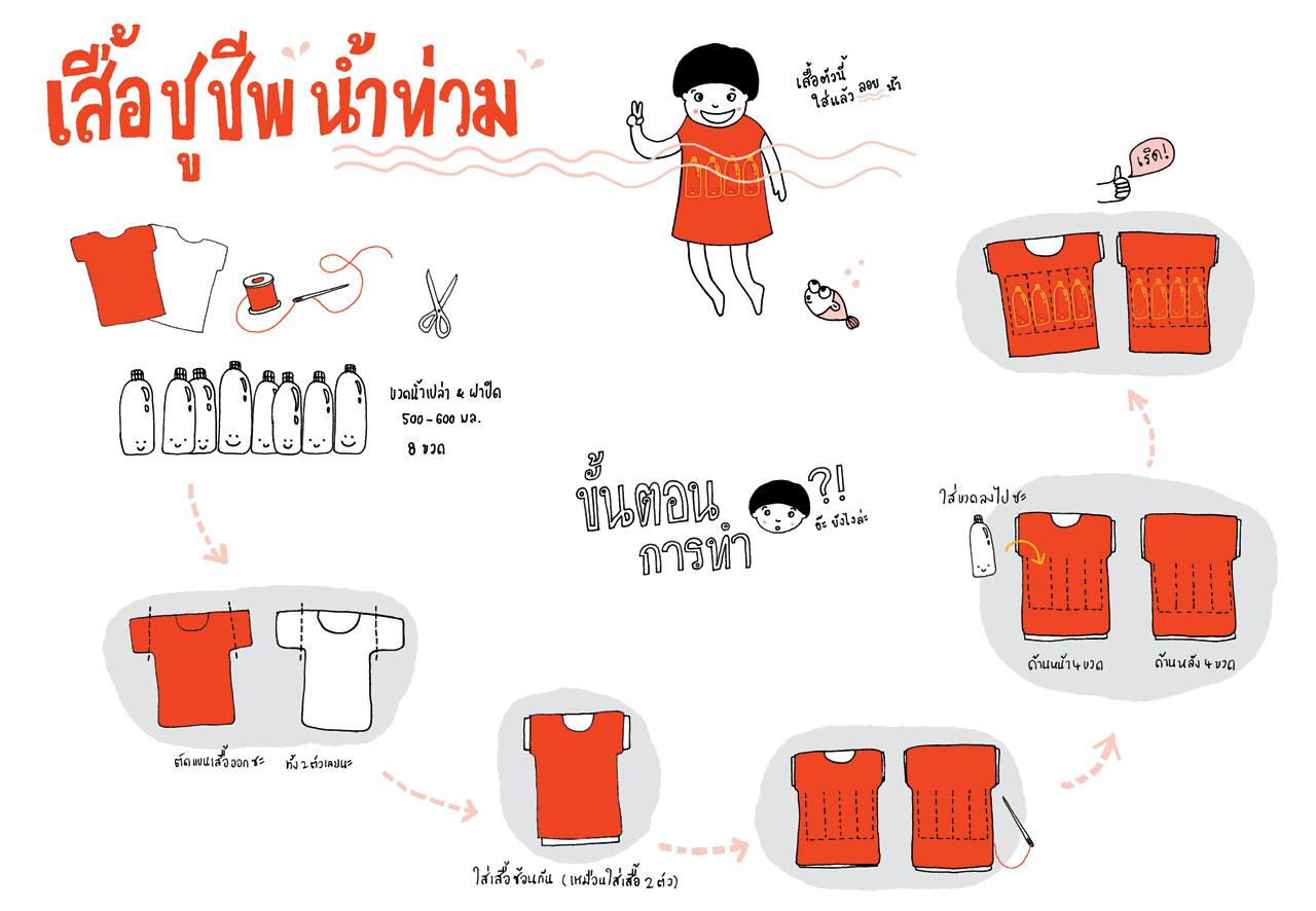“ต่อมา ช่วงที่น้ำยังไม่ท่วมเข้ากรุงเทพฯ เราเริ่มทำถุงผ้า ตั้งชื่อว่า “กระเป๋าน้อยคอยน้ำใจ” ออกแบบมา 2 ลาย คือ น้ำน้อยขี่ปลาวาฬ และเด็กผู้ชายใส่ห่วงยาง ตอนนั้นทำออกมา 100 ใบ เพื่อนำไปขายทางหน้าเฟซบุ๊กของเราเอง เพื่อไปช่วยผู้ประสบภัย ปรากฏฟีดแบ็กดี ขายหมดเร็วมาก ต่างประเทศก็มาซื้อ ต่อมามีเพจที่ทำเสื้อยืดขาย เลยไปช่วยออกแบบลายเสื้อยืดใหม่ให้เขา เอาไปสกรีนขายแบบไม่คิดเงิน”