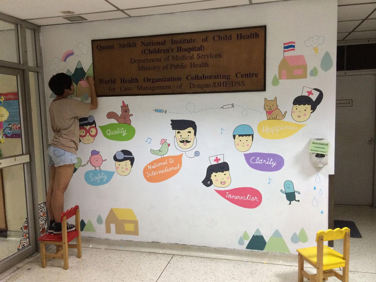 “งานที่ถือเป็นความท้าทายของน้ำน้อย คือ งานวาดภาพประกอบบนกำแพง ตอนนี้มีผลงานบนกำแพงที่สร้างสรรค์ออกมาเป็นหมาในรูปแบบลายเส้นของน้ำน้อยหลายสถานที่ อาทิ ชมรมคนรักเฟรนซ์ บูลด็อก แห่งประเทศไทย, คลินิกรักษาสัตว์, สปาและสระว่ายน้ำสัตว์เลี้ยง, สตูดิโอสำหรับถ่ายภาพ หลักการวาดของน้ำน้อยคือ ภาพของเราต้องไปเสริมสถานที่นั้นๆ ให้ดูดีขึ้น ต้องดูว่าบริเวณที่วาดให้บรรยากาศและทำหน้าที่ใดแก่สถานที่นั้นๆ เรียกว่า ต้องตีความการทำผลงานให้ต่างจากการวาดภาพประกอบทั่วไปพอสมควร โดยภาพประกอบกำแพงล่าสุดของน้ำน้อย คือ การวาดภาพประกอบซ่อมแซมทัศนียภาพของอาคารสำหรับผู้ป่วยเด็กโรคไข้เลือดออกของโรงพยาบาลเด็ก ราชวิถี”