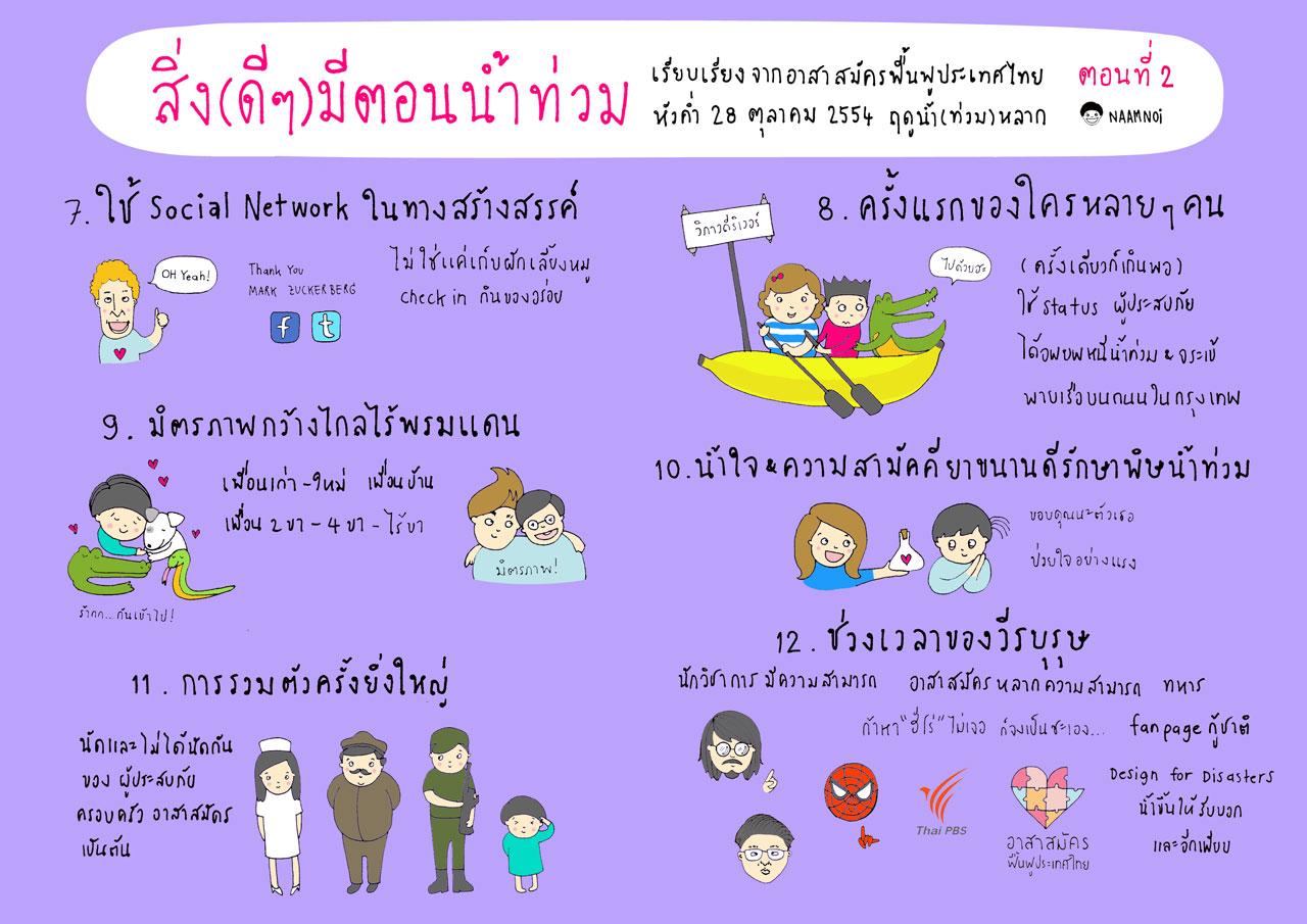 - ภาพวาดชุดน้ำท่วมในมุมต่างๆ ให้กำลังใจ อาทิ เซตภาพชุดให้กำลังใจ “รักษาใจตกน้ำ” “ข้อคิดจากคุณน้ำท่วม” ภาพชุด พา “ผู้ใหญ่ดื้อ” หนีน้ำ ภาพ “แต่งตัวตุ๊กตา” เซตแต่งตัวช่วงน้ำท่วม และเซตคู่มือซ่อมบ้าน