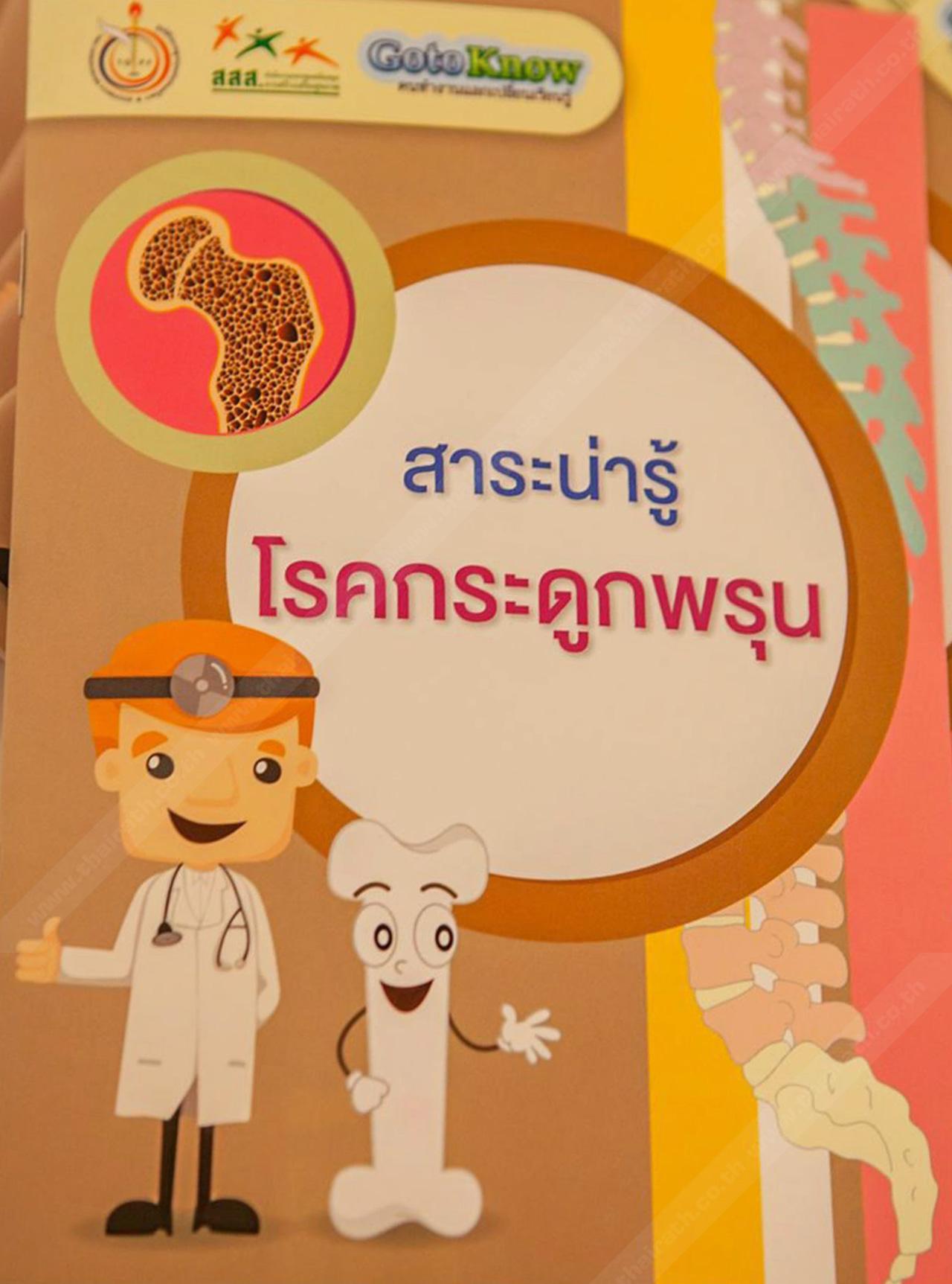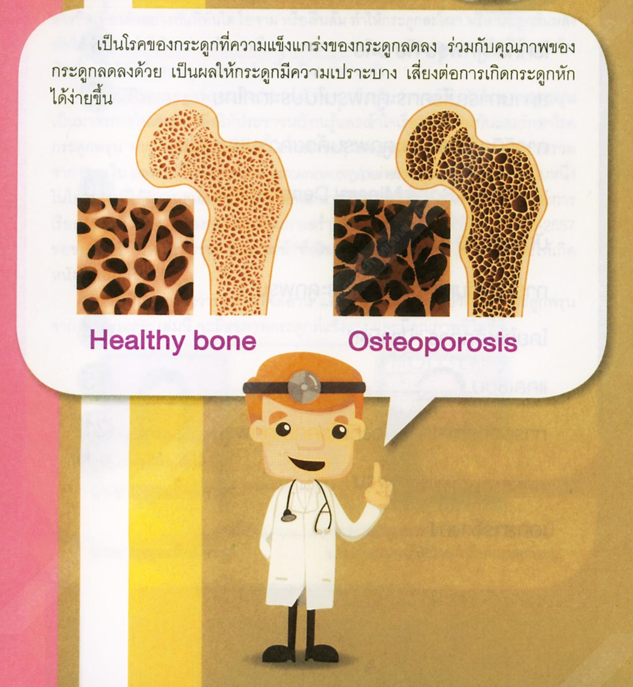 ด้าน นพ.อรรถฤทธิ์ ศฤงคไพบูลย์ ประธานมูลนิธิโรคกระดูกพรุนแห่งประเทศไทยฯ ได้ให้ความรู้เกี่ยวกับโรคกระดุกพรุนว่า โรคกระดูกพรุนเป็น 1 ในโรค NCDs (Non Communicationable Diseases) หรือกลุ่มโรคไม่ติดต่อเรื้อรัง ซึ่งเป็นกลุ่มโรคที่เกิดจากนิสัย หรือพฤติกรรมการดำเนินชีวิตที่ไม่เหมาะสม ไม่ว่าจะเป็นการบริโภคอาหาร การพักผ่อน และการออกกำลังกาย ตัวอย่างโรคในกลุ่มนี้ ได้แก่ โรคเบาหวาน, โรคความดันโลหิตสูง เป็นต้น ส่วนโรคกระดูกพรุน เป็นภาวะที่ความแข็งแกร่งของกระดูกลดลงด้วย ทำให้กระดูกมีความเปราะบาง เสี่ยงต่อการเกิดกระดูกหักได้ง่ายขึ้น ซึ่งภาวะสูญเสียมวลกระดูกของโรคนี้จะรุกคืบตลอดเวลา โดยไม่มีสัญญาณเตือนใดๆ จะรู้ตัวก็ต่อเมื่อกระดูกหักไปแล้ว ซึ่งกระดูกส่วนที่มีโอกาสหักได้ง่ายจากภาวะกระดูกพรุน คือ กระดูกสันหลัง, ข้อสะโพก, ข้อมือ และกระดูกแขนบริเวณหัวไหล่ และจะเกิดภาวะแทรกซ้อนอย่างต่อเนื่องจนเกิดอันตรายถึงชีวิต