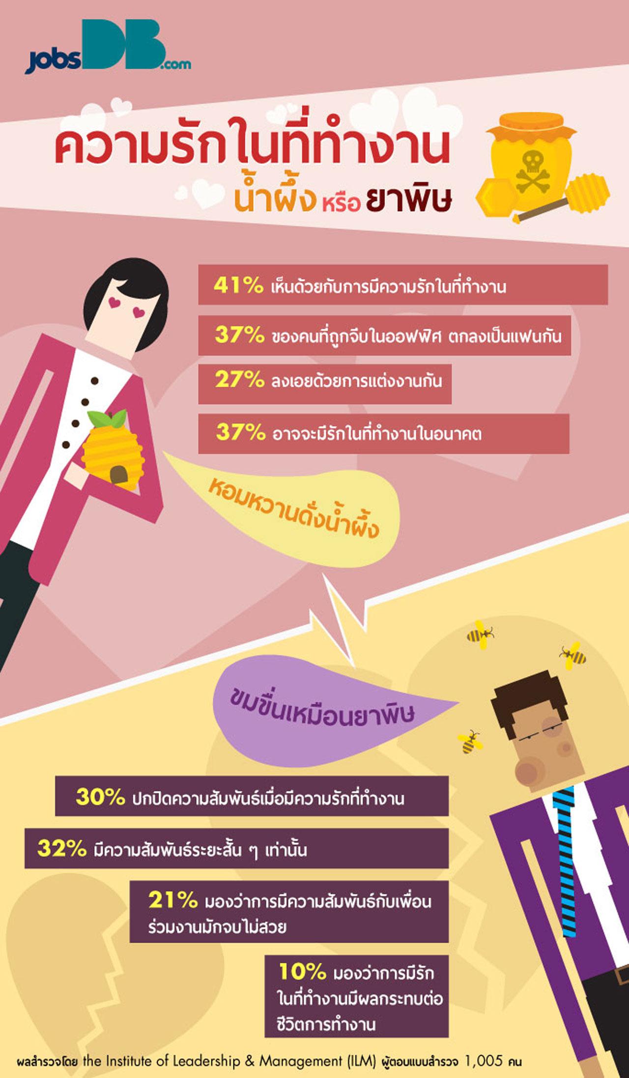 บริษัท จัดหางาน จ๊อบส์ ดีบี (ประเทศไทย) จำกัด ในฐานะบริษัทจัดหางานได้รวบรวมข้อมูลเกี่ยวกับความรักในออฟฟิศในแง่มุมต่างๆ มาอธิบายชี้ตามเหตุผล และผลกระทบที่จะเกิดขึ้นเมื่อรักมาพร้อมความสุขและทุกข์ มาดูกันว่า การคบกับคนในออฟฟิศมีข้อดี ข้อเสียอย่างไร รักครั้งนี้จะเป็นน้ำผึ้ง หรือยาพิษ ขึ้นอยู่กับคนสองคน