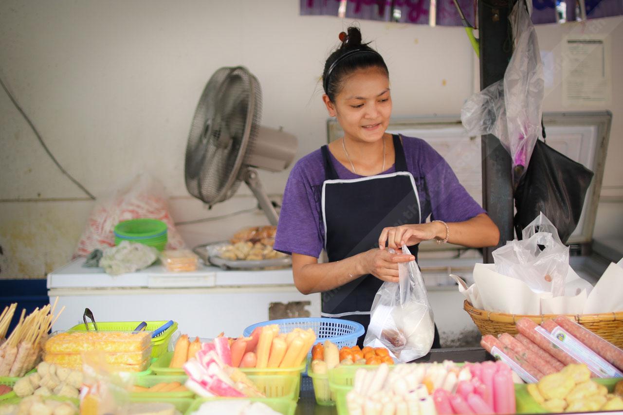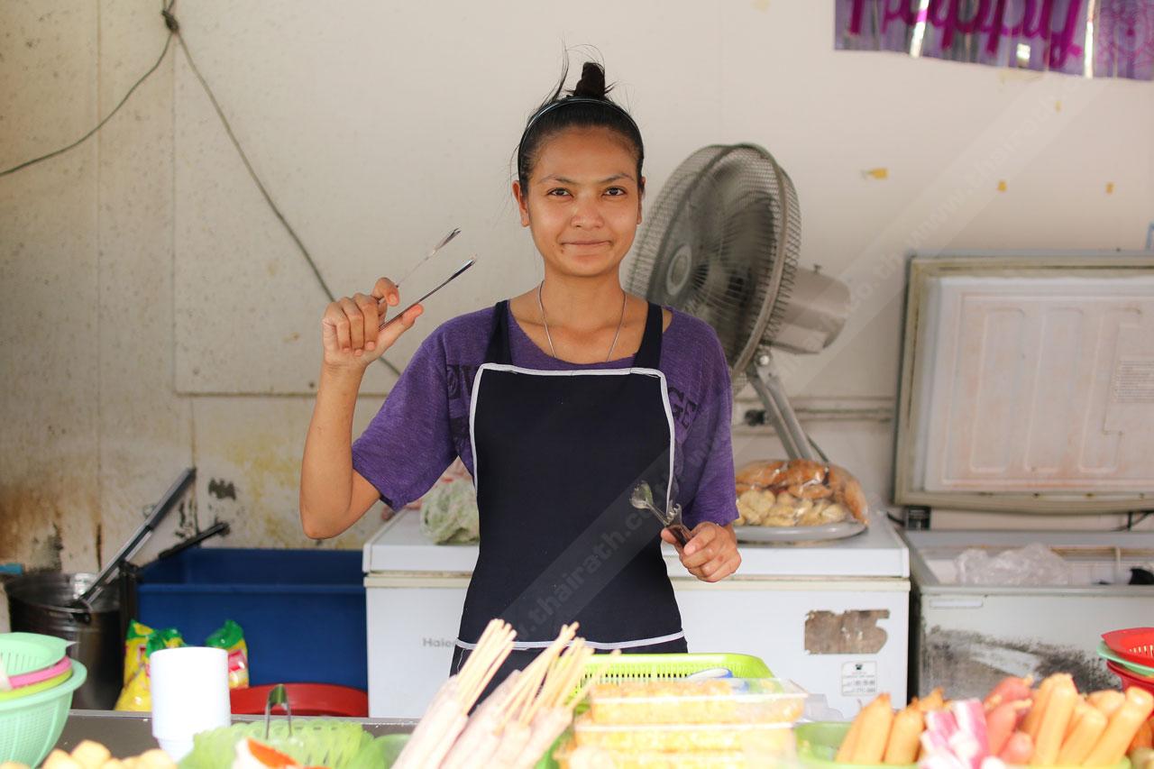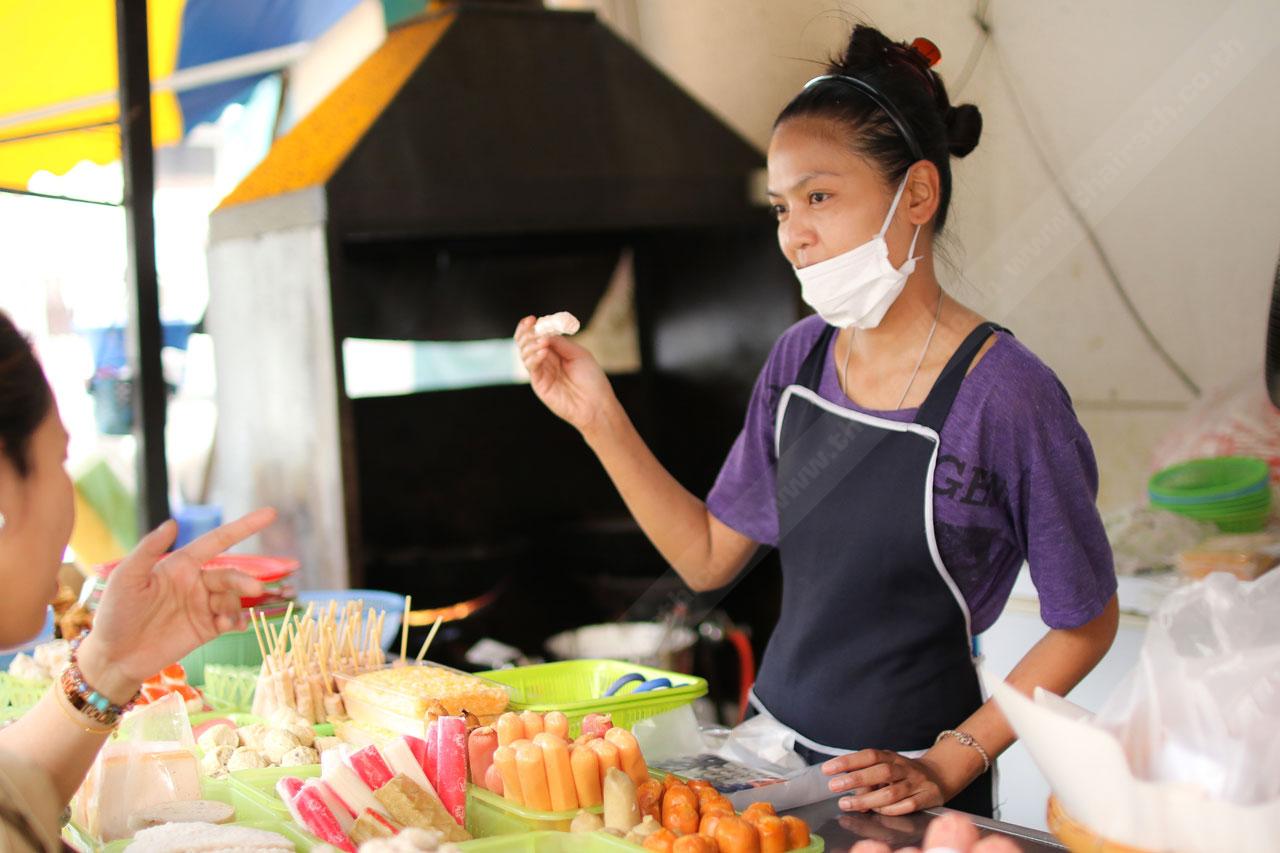ตลอดการพูดคุยกัน ลูกค้าเริ่มเข้ามาที่ร้านตลอดๆ จี๊ดเห็นได้ว่า มีทั้งคนธรรมดาในละแวกนั้น พนักงาน คนทำงาน นักศึกษา ต่างคนต่างมาเลือกของ ก่อนที่แม่ค้าจะหย่อนอาหารลงกระทะใบโต พูดคุย หรือรอกันสักแป๊บ อาหารร้อน รสชาติอร่อยๆ ก็พร้อมเสิร์ฟใส่ถุง แถมด้วยน้ำจิ้มรสเด็ด สูตรลับของทางร้านที่มัดใส่ถุงไว้ดิบดี ซึ่งร้านนี้ไม่มีตักราดนะจ๊ะ