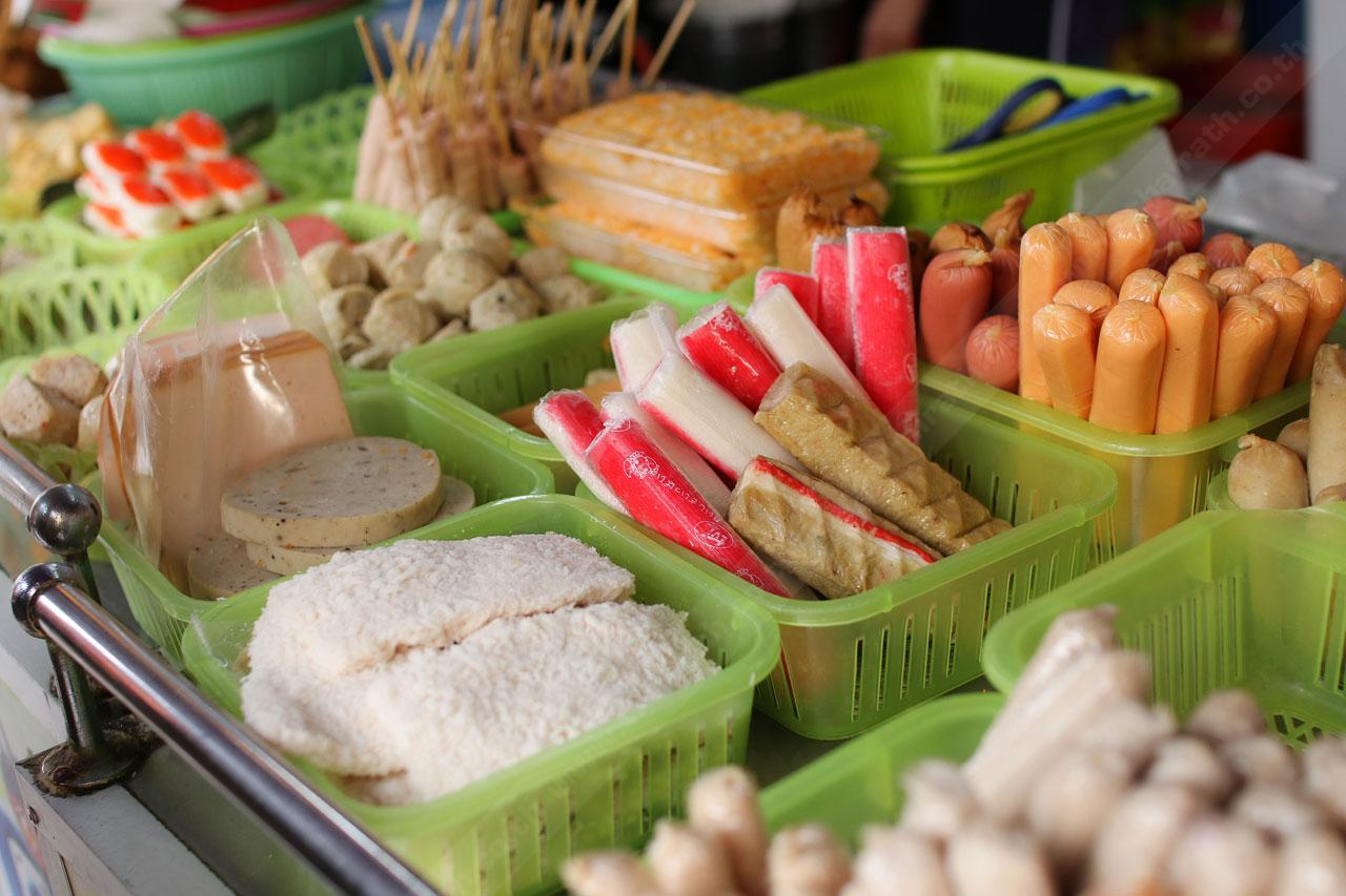 ไก่ทอด เฟรนซ์ฟรายปูอัด ที่หลักๆ แต่ก็มีคละกันไป ด้วยลูกชิ้นกุ้ง ปลาชีส ไก่จ้อ ไก่แผ่น บาร์บีคิวปลาหมึก แหนม หมูยอ ปูอัด เน็คเก็ต ปอเปี๊ยะ น้ำพริก เป็นของเสริมตัวเลือกให้ลูกค้า แถมขายน้ำแข็ง น้ำอัดลม น้ำดื่มด้วย