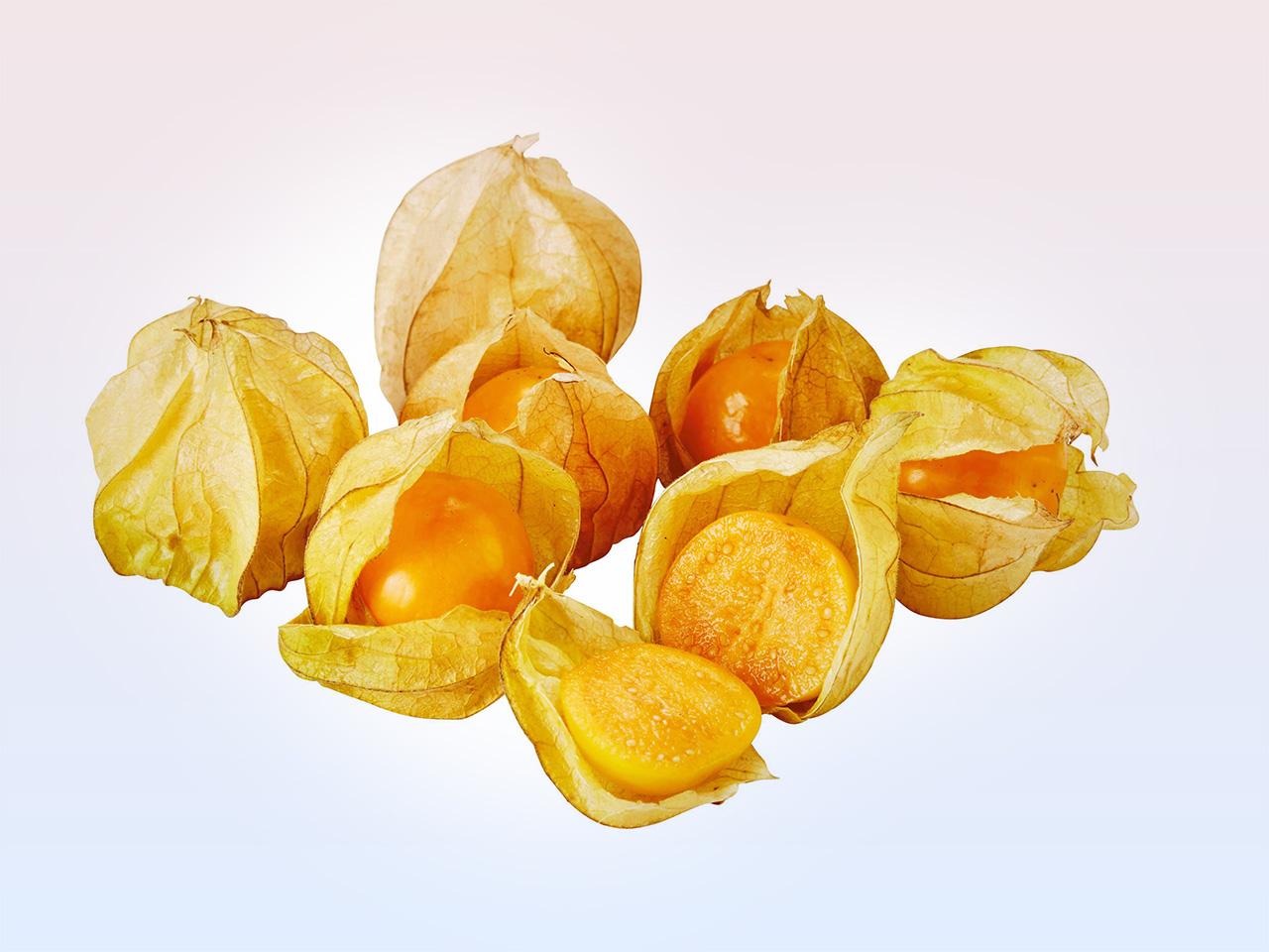 สำหรับ “เคพกูสเบอร์รี่” เป็นผลไม้เมืองหนาวรูปทรงกลมขนาดเท่าลูกเชอร์รี่ ห่อหุ้มด้วยกลีบเลี้ยงคล้ายเยื่อกระดาษ เมื่อแก่เต็มที่ผลจะมีสีเหลืองปนส้ม รสชาติหวานอมเปรี้ยว มีถิ่นกำเนิดอยู่ในบราซิล จะให้ผลผลิตในช่วงเดือนมกราคมถึงมีนาคม ส่วนมากจะนิยมทานเป็นผลสดๆ หรือไม่ก็นำมาชุบช็อกโกแลต และ จุ่มน้ำผึ้ง ใส่ในสลัด ทำน้ำผลไม้ หรือแยม นอกจากจะหน้าตาสวยน่าทานสุดๆ ผลไม้ชนิดนี้ยังอุดมด้วยคุณประโยชน์มากมาย ทั้งวิตามินเอ ช่วยบำรุงสายตา และวิตามินซี ช่วยป้องกันไข้หวัด ขณะเดียวกัน ยังเป็นแหล่งธรรมชาติที่ดีของสารต้านอนุมูลอิสระ เมื่อเทียบกับผลไม้ชนิดอื่นๆ มีรายงานการวิจัยพบว่า อุดมไปด้วยสาร Anthocyanins สามารถลดการเจริญเติบโตของเซลล์มะเร็งประเภท HT-29 และ HCT-116 ตลอดจนหยุดยั้งการเจริญเติบโตของเซลล์เนื้องอก