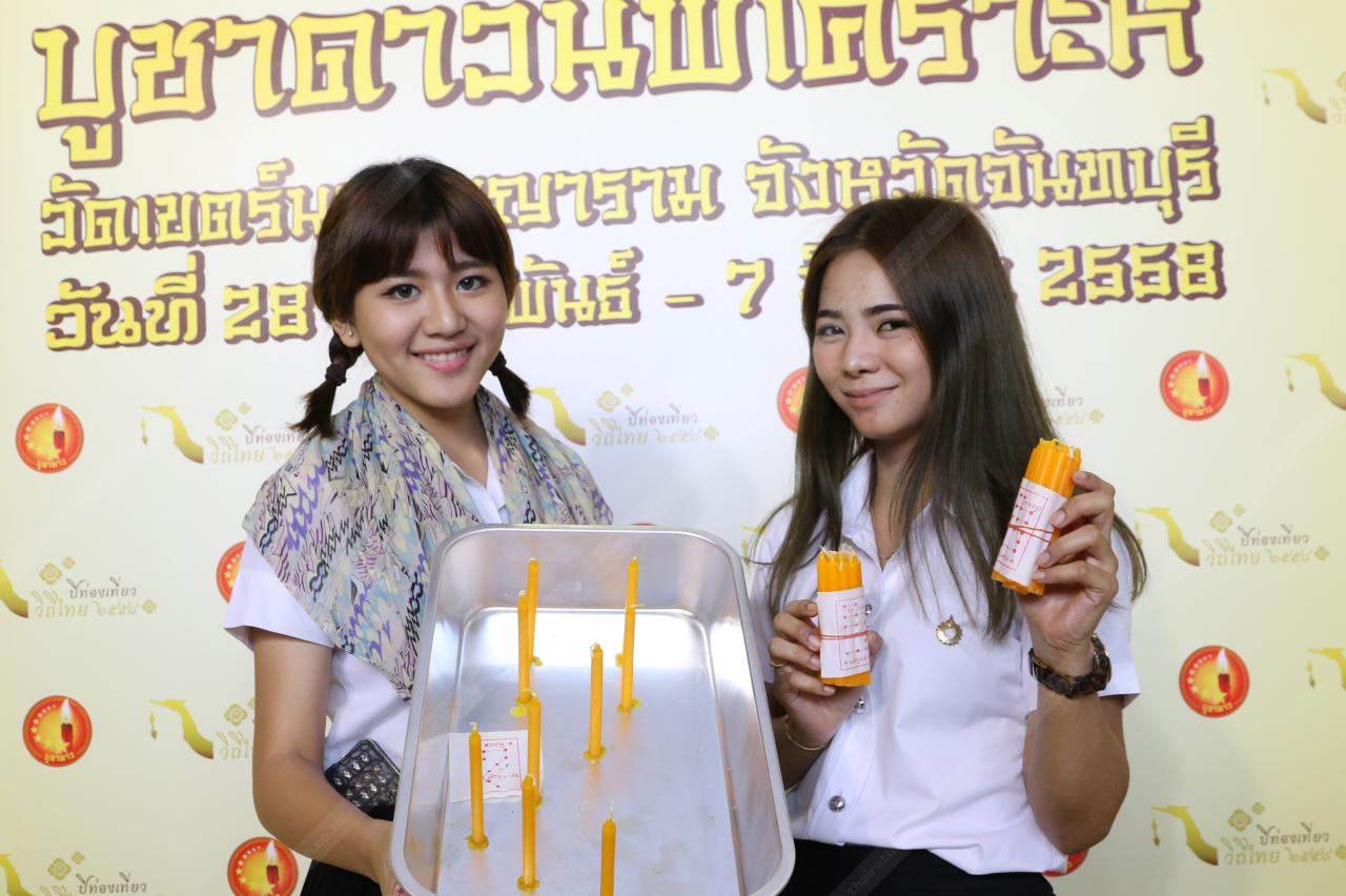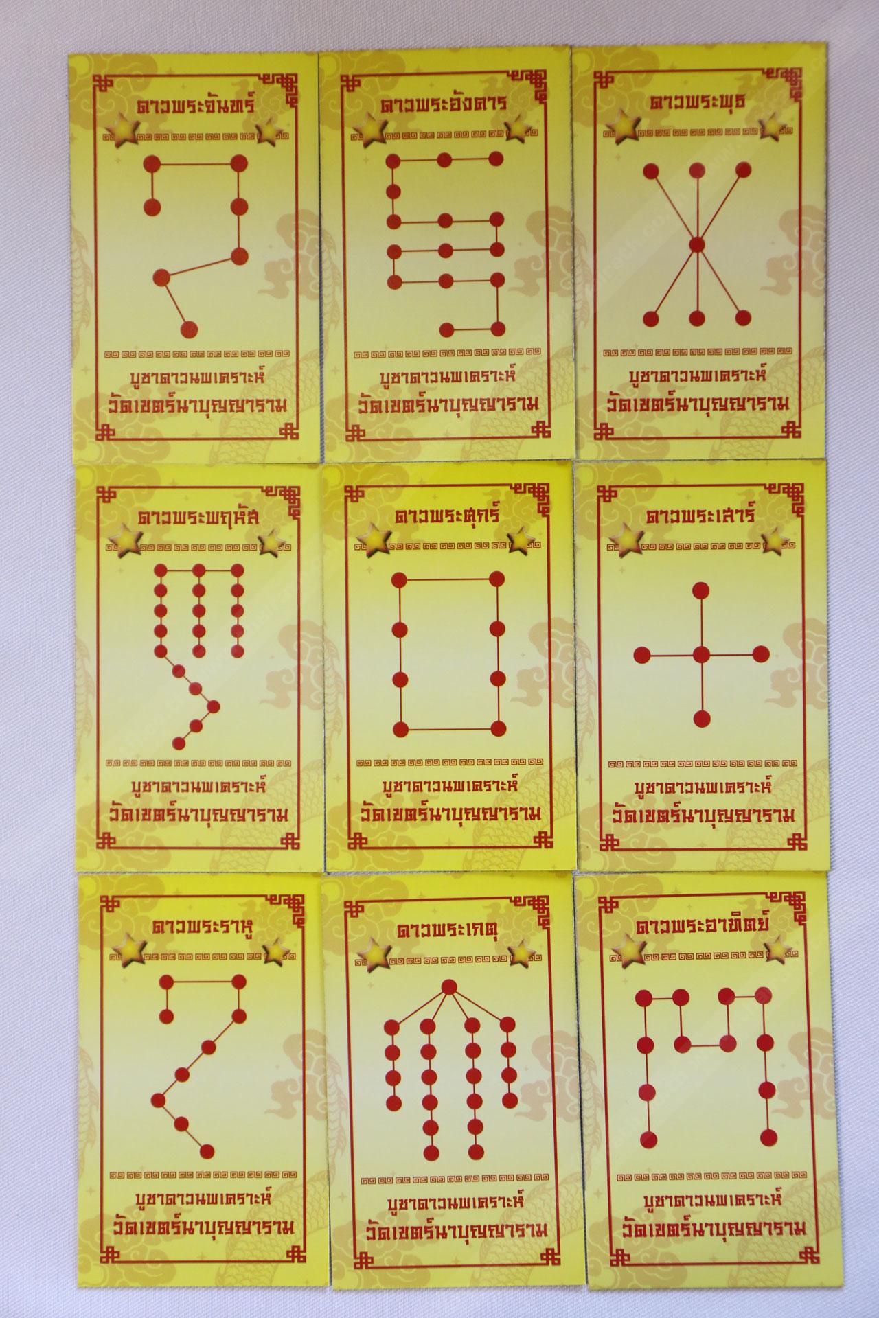 เมื่อเช็กดวงดาวประจำปีเกิดได้แล้ว ก็ไปที่ซุ้มแจกเทียน เจ้าหน้าที่จะแจกเทียนตามจำนวนที่ระบุไว้สำหรับบูชาดาวแต่ละดวงโดยเฉพาะ ยกตัวอย่าง ถ้าเป็นดาวพระอาทิตย์จะต้องใช้เทียน 12 เล่ม, ดาวพระพุธใช้ 7 เล่ม, ดาวพระราหูใช้ 9 เล่ม เป็นต้น พร้อมกันนี้จะได้รับบัตรดวงดาวแสดงตัวอย่างในการจุดเทียนมาด้วย