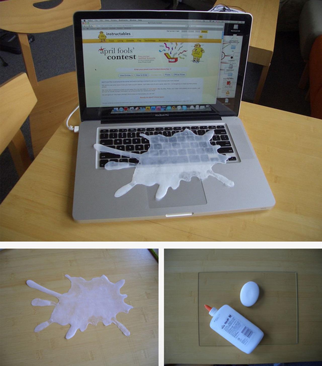 8. ทำให้เพื่อนร่วมงานตกใจด้วยการสาดน้ำนมปลอมที่ทำขึ้นมาเองลงบนโน้ตบุ๊ก