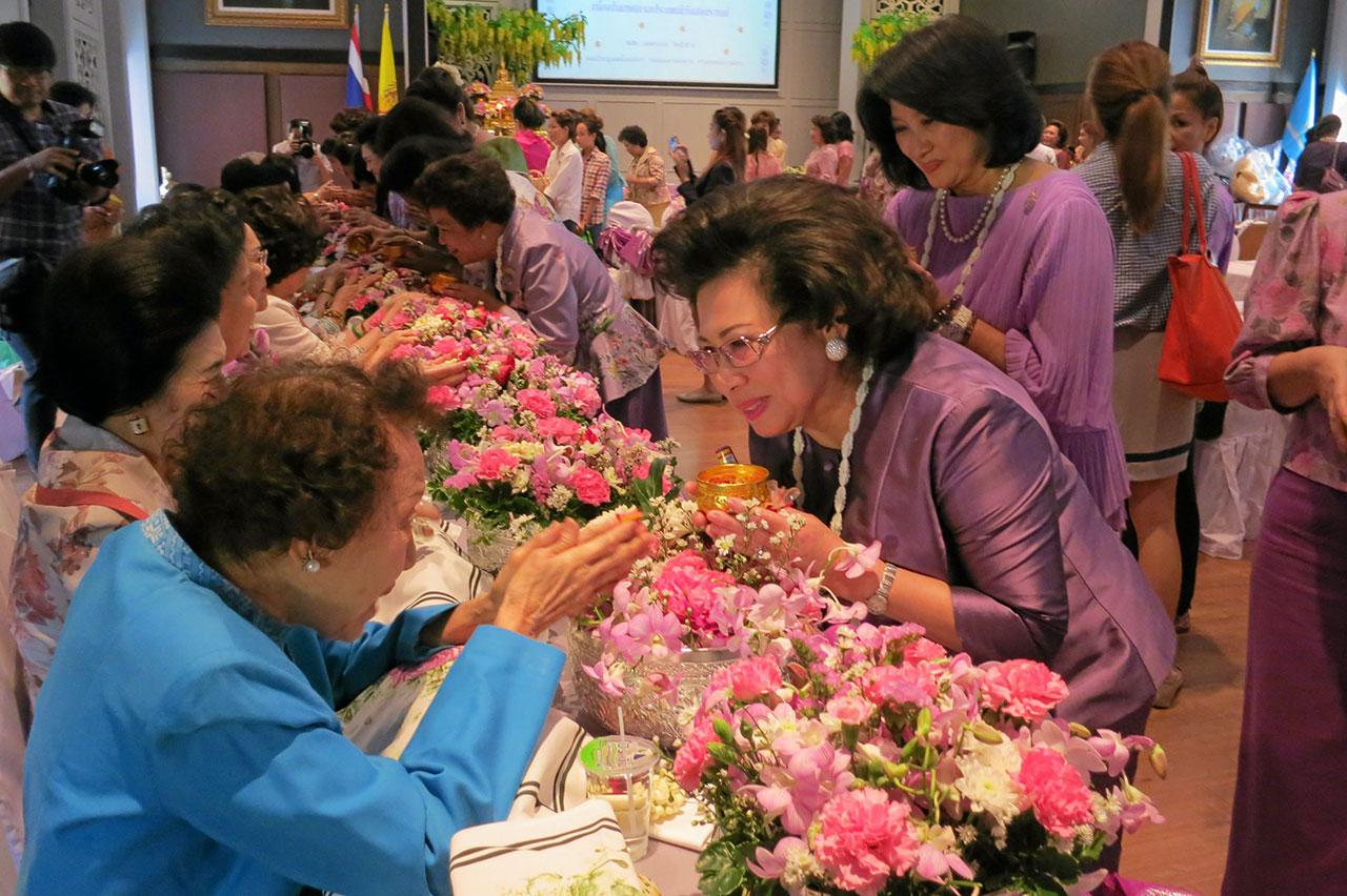บรรยากาศในงานคึกคักและอบอุ่นไปด้วยอดีตประธานสภาสตรีแห่งชาติฯ ที่มาร่วมงาน อาทิ ท่านผู้หญิงสุมาลี จาติกวนิช, พลตรีหญิง คุณหญิงอัสนีย์ เสาวภาพ, เรือนแก้ว กุยยกานนท์ แบรนด์ท, ยุวดี นิ่มสมบุญ, เยาวเรศ ชินวัตร และผู้อาวุโสที่คุ้นเคย อาทิ คุณหญิงโรส บริบาลบุรีภัณฑ์, เดือนฉาย คอมันตร์, อนุรัชนี ศิริสัมพันธ์ ฯลฯ พิธีการเริ่มด้วยการแห่พระพุทธรูป เพื่อเป็นสิริมงคล จากนั้น ประธานและรองประธานสภาสตรีฯ รศ.ดร.วีณา เชิดบุญชาติ และ ม.ร.ว.เบญจภา ไกรฤกษ์ ได้นำเหล่าสมาชิกรดน้ำขอพรผู้ใหญ่ เสร็จแล้ว ท่านผู้หญิงสุมาลี จาติกวนิช อดีตประธานสภาสตรีแห่งชาติฯ เป็นตัวแทนผู้อาวุโส กล่าวขอบคุณคณะกรรมการทุกคนที่ยังระลึกถึงผู้อาวุโส และบอกว่า ประเพณีนี้เป็นประเพณีที่น่าชื่นชม เป็นการมอบไมตรีให้แก่กัน และทุกคนได้มาพร้อมเพรียง น่าอบอุ่นใจ ความพร้อมเพรียงสามัคคีนี้จะส่งให้การทำงานทุกอย่างประสบความสำเร็จ และปิดท้ายด้วยว่า ขอบคุณที่ทำให้พวกเรามีความสุข...งานนี้จึงสร้างความประทับใจให้ทุกคนถ้วนหน้ากัน.