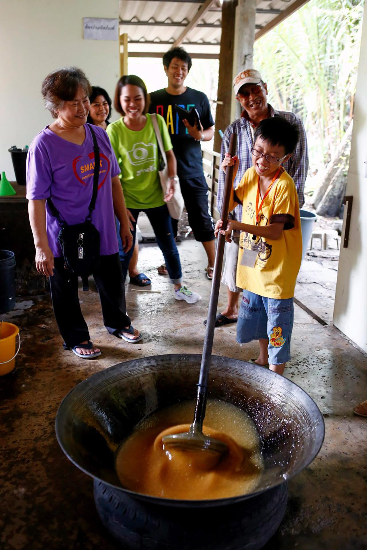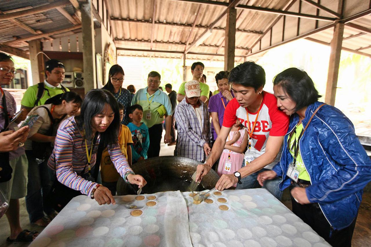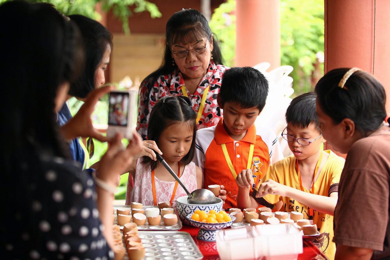 เริ่มต้นกิจกรรมด้วยการนำ 10 ครอบครัวมุ่งสู่จังหวัดสมุทรสงคราม เข้าสักการะพระบรมสารีริกธาตุองค์สมเด็จพระสัมมาสัมพุทธเจ้า ณ วัดบางแคน้อย พร้อมทำบุญถวายสังฆทาน จากนั้นเดินทางสู่วัดบางกุ้ง กราบสักการะ “หลวงพ่อนิลมณี” ซึ่งประดิษฐานอยู่ในอุโบสถปรกโพธิ์ โบราณสถานสำคัญซึ่งเป็นส่วนหนึ่งในหน้าประวัติศาสตร์ไทยมาตั้งแต่สมัยอยุธยา ต่อด้วยช่วงบ่าย ให้ทุกครอบครัวเรียนรู้การทำขนมไทย ณ อาคารกลางน้ำ ภายในอุทยาน ร.2 อาทิ ขนมรังไร, ลูกชุบ, ขนมชั้นกุหลาบ และวุ้นในไข่ เป็นต้น จากนั้นลงเรือไปพบกับกลุ่มวิสาหกิจชุมชนบ้านริมคลอง ซึ่งได้รับการจัดอันดับเป็น 1 ใน 20 ชุมชนท่องเที่ยวเชิงสร้างสรรค์ เพื่อเรียนรู้วิธีทำน้ำตาลมะพร้าวอันเป็นเอกลักษณ์ของชาวอัมพวา พร้อมเพลิดเพลินกับการถักหมวกจากใบมะพร้าว และปิดท้ายทริปด้วยการล่องเรือชมวิถีชีวิตชาวอัมพวาริมฝั่งแม่น้ำแม่กลองในยามเย็น