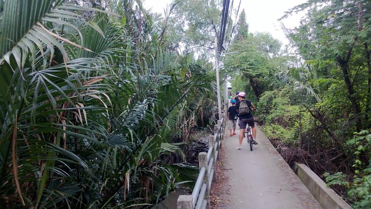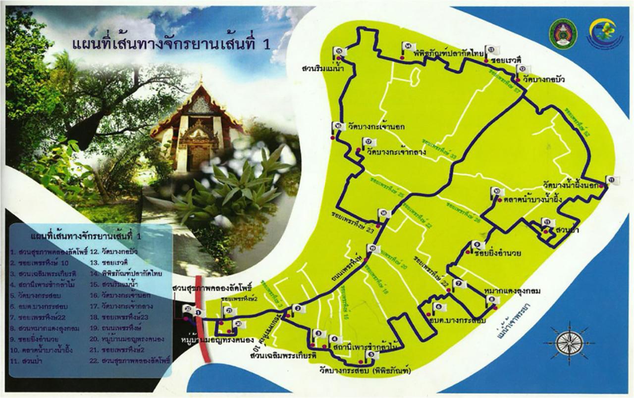 ตามเส้นทางหลักที่นักปั่นนิยมปั่นกัน คือ ปั่นไปตามเส้นทางที่จะไปมาทางซอยเพชรหึงษ์ 33 ตรงไปตามป้ายที่ชี้ว่าไปสวนสาธารณะศรีนครเขื่อนขันธ์ เลี้ยวตามทางเข้าไปได้เลย จากนั้นจะเห็นป้ายบอกสถานที่ท่องเที่ยวอยู่ตลอดทาง ที่เด่นๆ ก็เช่น ร้านกาแฟน่านั่ง พิพิธภัณฑ์ปลากัดไทย บ้านธูปหอมสมุนไพร (มีสอนนักท่องเที่ยวทำธูปหอมและผ้ามัดย้อมด้วย) และ Bangkok Tree House (เป็นโรงแรมแนวกรีนไลฟ์ มีร้านอาหารและร้านกาแฟด้านใน ตกแต่งสวยงามบรรยากาศดี)