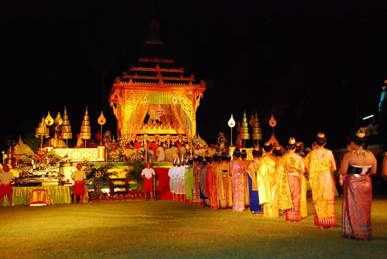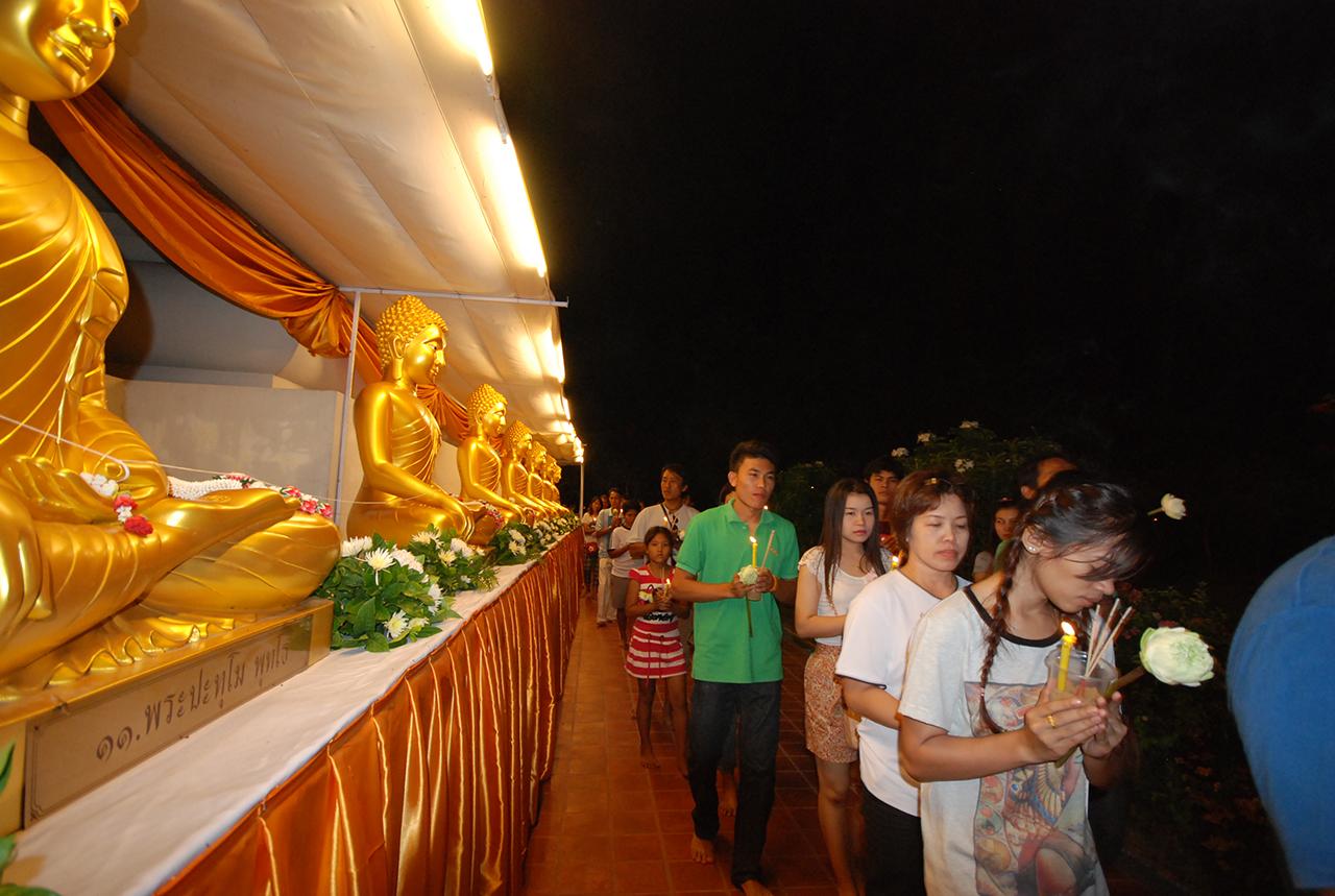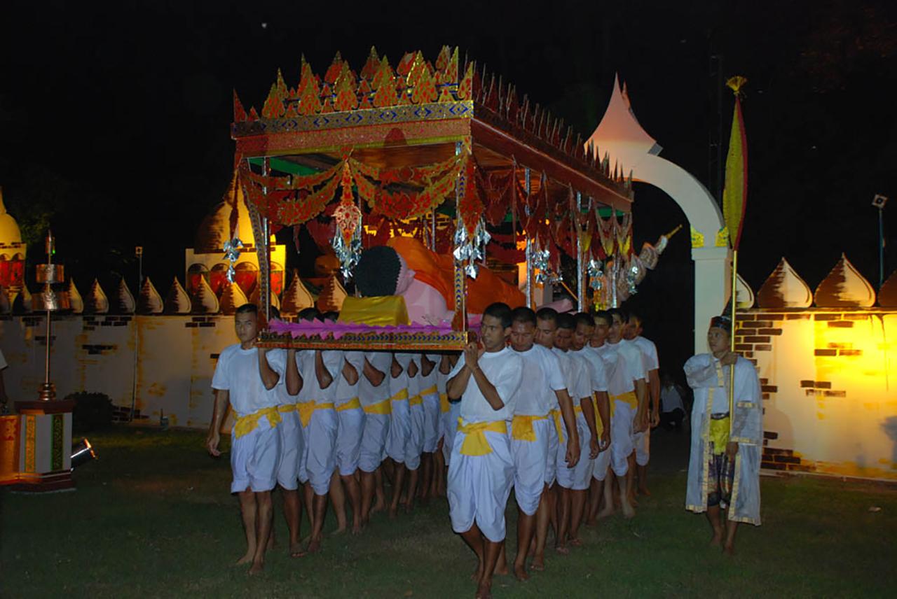 ภายในงานจะมีพิธีทางศาสนาช่วงเช้าตั้งแต่เวลา 06.00-11.30 น. ซึ่งประชาชนสามารถมาร่วมสวดมนต์รับอรุณ พร้อมทำบุญตักบาตรข้าวสารอาหารแห้งแด่พระภิกษุสงฆ์จำนวน 54 รูป ส่วนพิธีในช่วงเย็นจะจัดขึ้นเวลา 17.00-20.00 น. ณ พระธาตุบังพวน เมืองโบราณ มีการแสดงพระธรรมเทศนาโดยพระราชรัตนมุนี วัดพิชัยรัตนาราม พิธีเจริญพระพุทธมนต์โดยพระสงฆ์ 10 รูป และพุทธศาสนิกชนร่วมเวียนเทียนรอบพระธาตุบังพวนและพระพุทธเจ้า 28 พระองค์