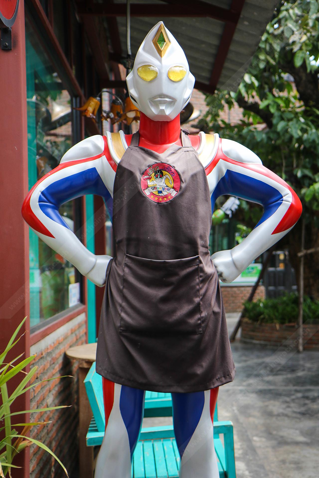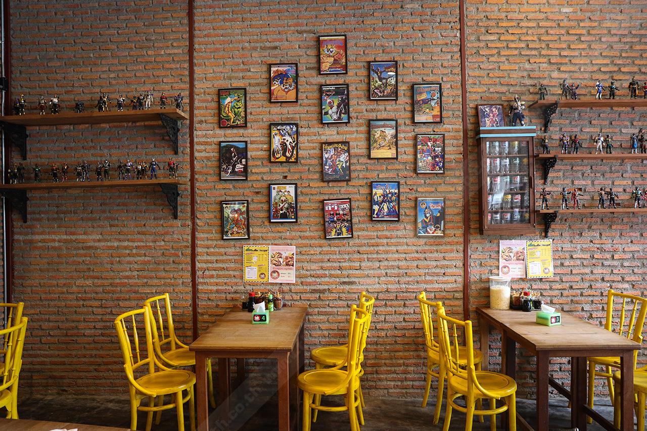 ร้านเราอยู่ตรงข้ามมหาวิทยาลัยเกษตรศาสตร์ และลูกค้าส่วนใหญ่เป็นนักศึกษาประมาณ 70% ของลูกค้าทั้งหมด ตอนเราคิดคอนเซปต์ เราคิดกันว่า อะไรที่ทำให้เด็กๆ รู้จักและจดจำ คำตอบคือ ไอ้มดแดง เรามองว่าเด็กทุกคนจะต้องรู้จักการ์ตูนตัวนี้อย่างแน่นอน จึงเลือกยอดมนุษย์มาเป็นสัญลักษณ์และคอนเซปต์ในการตกแต่งร้าน