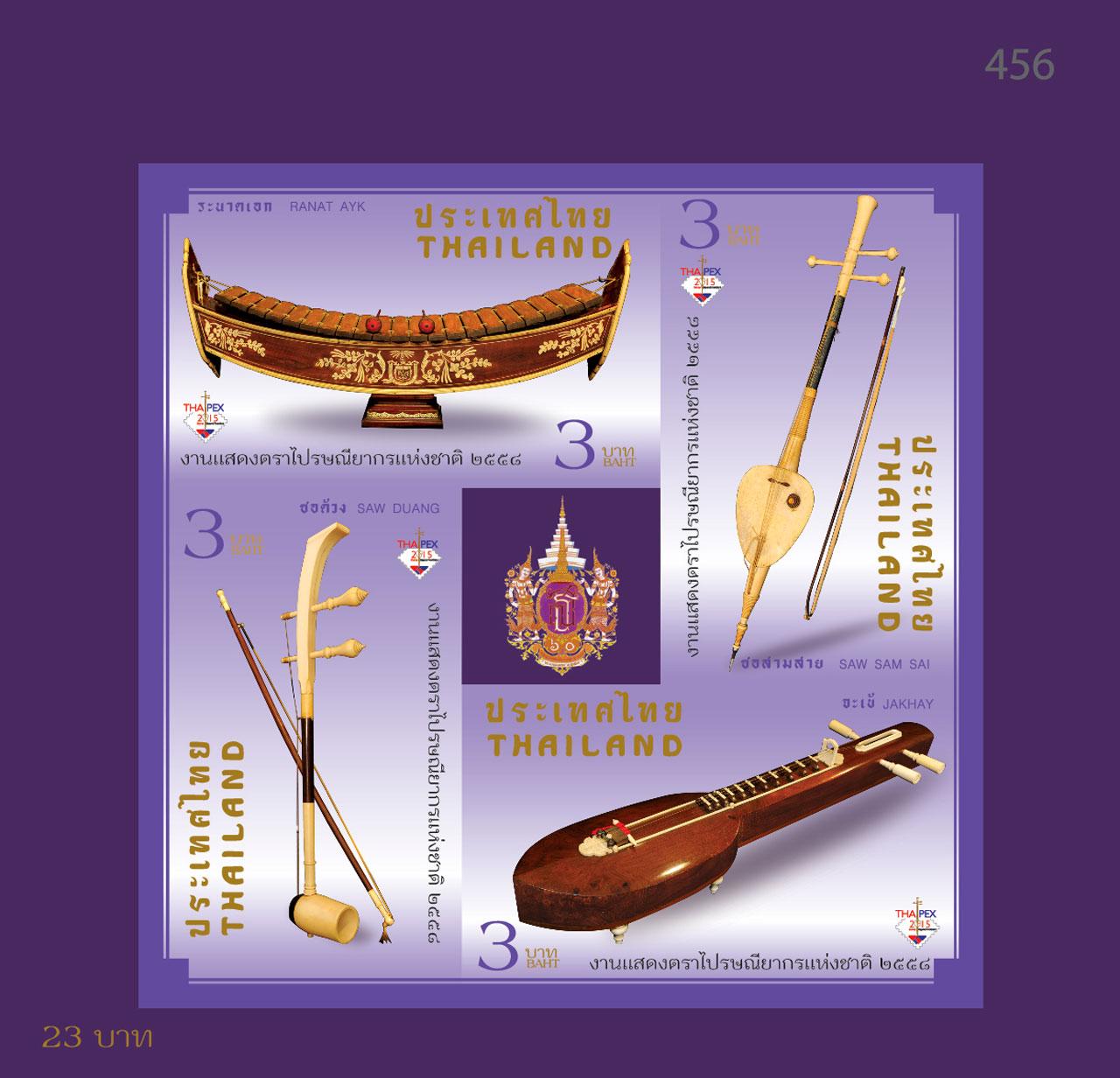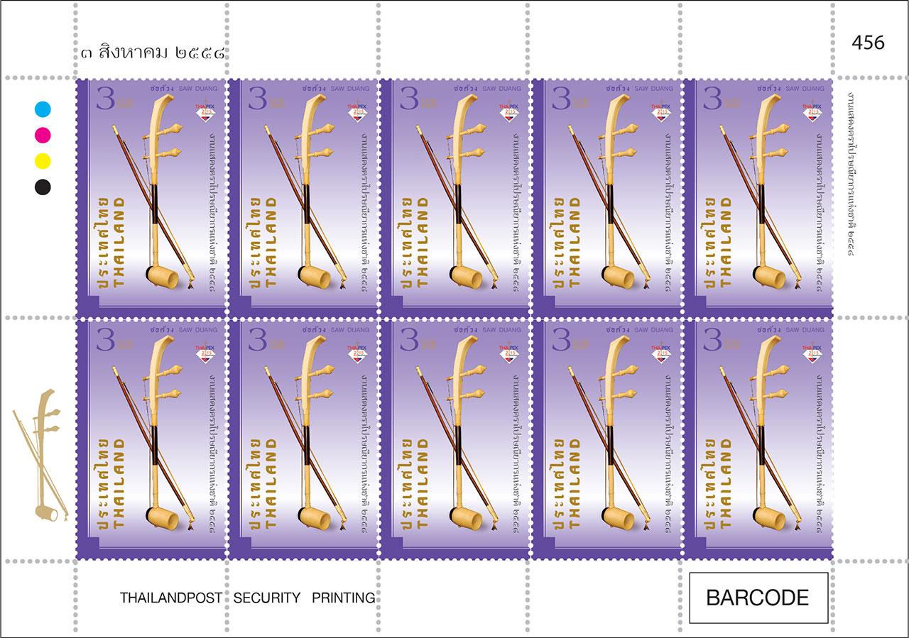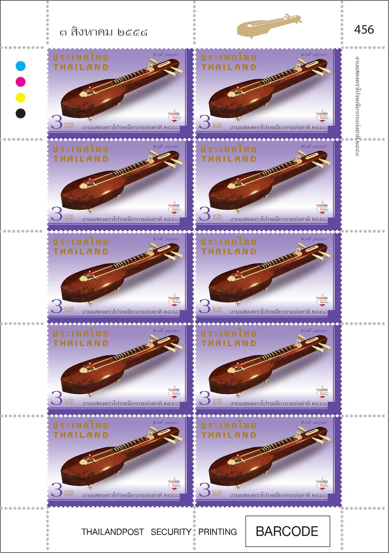 เป็นภาพเครื่องดนตรีไทยส่วนพระองค์ 4 ชนิด คือ ระนาดเอก จะเข้ ซอด้วง และซอสามสายที่พระราชทานมาเป็นแบบตราไปรษณียากร โดยสามารถสแกนภาพแผ่นชีทที่ระลึกเพื่อชมและฟังการบรรเลงเครื่องดนตรีไทยทั้งสี่ชนิดนี้ ผ่านภาพแสตมป์บนแผ่นชีทที่ระลึก ในเพลง “ลาวดำเนินทราย (ทางเปลี่ยน)” ซึ่งประพันธ์โดยหลวงประดิษฐ์ไพเราะ และบรรเลงโดยนักดนตรีจากสำนักการสังคีต กรมศิลปากร โดยมี ดร.สิริชัยชาญ ฟักจำรูญ ศิลปินแห่งชาติ สาขาศิลปะการแสดง (ดนตรีไทย) พ.ศ. 2557 เป็นที่ปรึกษาด้านข้อมูล