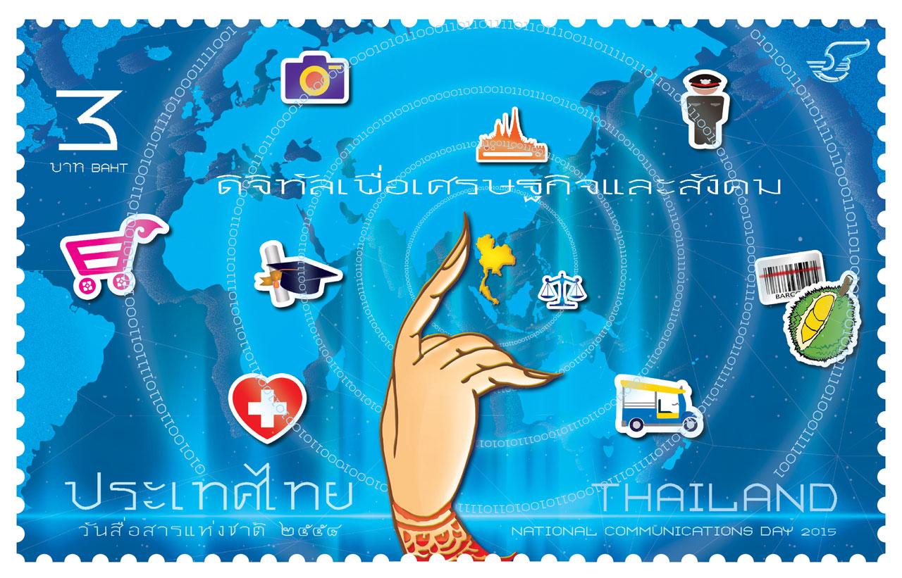 แสตมป์ชุดวันสื่อสารแห่งชาติปีนี้ อิงกับกระแสของเศรษฐกิจดิจิทัล หรือ Digital Economy ที่กำลังเป็นกระแสหลักของวงการในปัจจุบัน ภาพแสตมป์สื่อถึงการเชื่อมโยงโครงข่ายสื่อสารล้ำยุคแบบไร้พรมแดน ผ่านปลายนิ้วสัมผัสรูปลักษณ์จิตรกรรมไทย แต่ที่สุดล้ำนำสมัยเห็นจะเป็นแอพพลิเคชั่นไฮเทคบนดวงแสตมป์ สนับสนุนโดยกระทรวงเทคโนโลยีสารสนเทศและการสื่อสาร หรือไอซีที ซึ่งกำลังจะแปรเปลี่ยนไปเป็น กระทรวงดิจิทัลเพื่อเศรษฐกิจและสังคม ในไม่ช้านี้ เศรษฐกิจดิจิทัล คือการขับเคลื่อนเศรษฐกิจโดยนำเทคโนโลยี หรือไอที มาใช้ในการสร้างอาชีพ และดำเนินกิจกรรมต่างๆ ตั้งแต่การผลิตไปจนถึงการขาย โดยมุ่งเน้นให้ผู้คนในสังคม มีใช้ ใช้เป็น แก้ปัญหาได้ และก่อเกิดนวัตกรรมด้วยเทคโนโลยีดิจิทัล ออกจำหน่าย 4 ส.ค. 2558 ชุดละ 3 บาท ซองวันแรกจำหน่าย 10 บาท