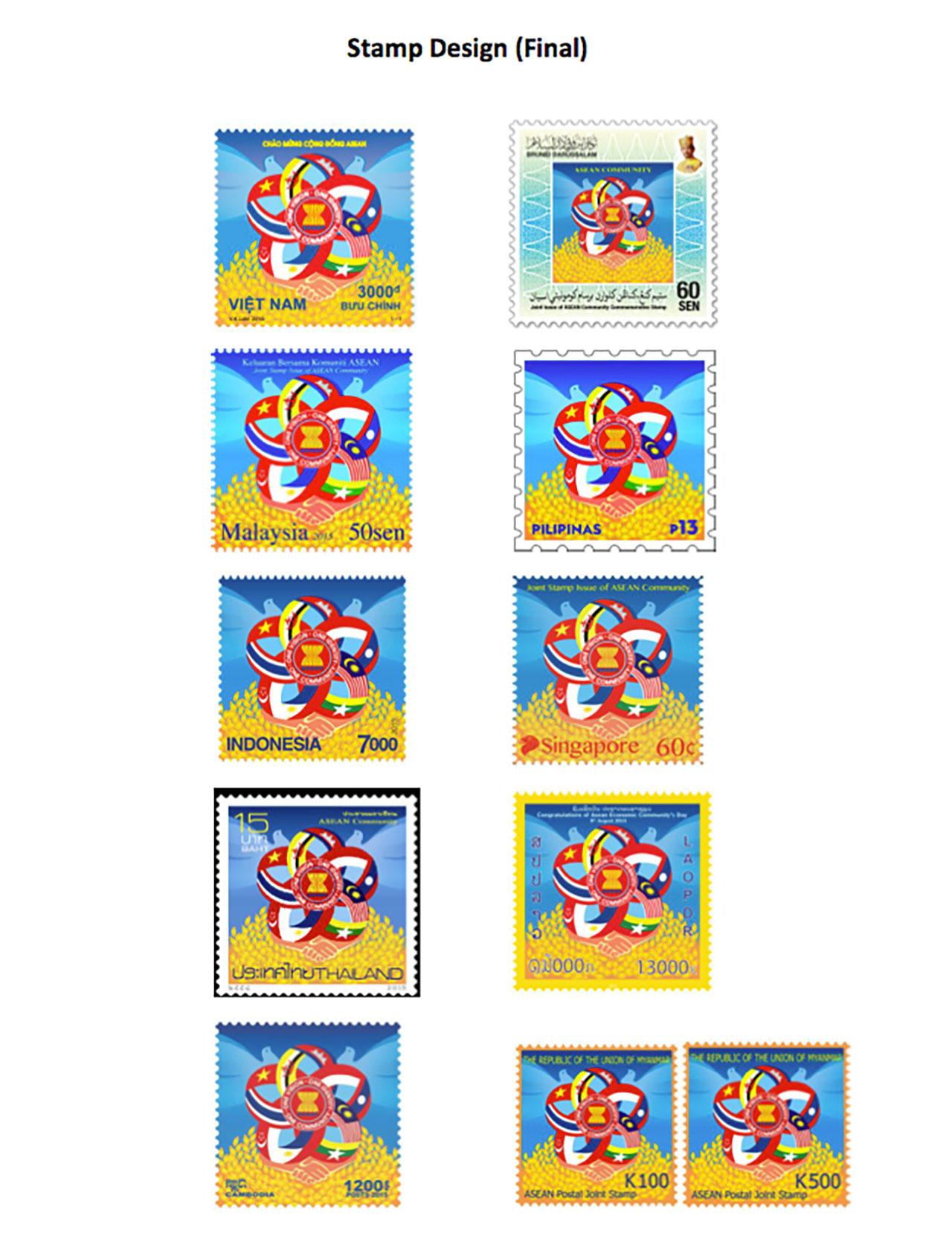 ปรากฏการณ์ใหม่ของแสตมป์ร่วมหลายประเทศที่ออกวันเดียวกัน ภาพเดียวกัน และเป็นหนึ่งดวงเดียวกัน พร้อมตราประทับที่เหมือนกันอีกด้วย แสตมป์เป็นภาพวาดสีสันสวยงาม สื่อความหมายอย่างครบถ้วนลงตัวทั้งธงชาติ 10 ประเทศสมาชิกที่เชื่อมร้อยเป็นดอกไม้เบ่งบานล้อมรอบโลโก้อาเซียนและคำขวัญ โดยมีคู่นกพิราบเป็นพื้นหลัง สองมือประสานมิตรอยู่ด้านล่าง สะท้อนซึ่งสันติภาพแห่งมิตรไมตรี พร้อมรวงข้าวสีทองเป็นพื้นฐานเพื่อสื่อถึงเอกลักษณ์ร่วมทางเกษตรกรรมของชาวอาเซียนทั้งมวล ขณะที่ตราประทับสื่อให้เห็น 3 เสาหลัก (การเมืองความมั่นคง/ เศรษฐกิจ/ สังคมและวัฒนธรรม) ที่ประกอบขึ้นเป็นประชาคมอาเซียน ทั้งสองภาพต้นแบบล้วนเป็นผลงานจากเวียดนามที่ได้รับการตัดสินจากประกวดแบบภาพแสตมป์และตราประทับ ซึ่งประเทศไทยเป็นเจ้าภาพจัดขึ้นเมื่อต้นปี 2558 นอกจากนี้ยังกำหนดให้แสตมป์ของทุกประเทศเป็นชนิดราคาที่ส่งเสริมการส่งไปรษณีย์ระหว่างประเทศด้วย