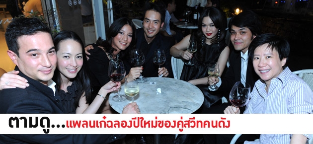 ประเดิมความหวานด้วยสาวปากแดง ดวง-วรรณพร ที่ควงสามี อธิชัย โปษยานนท์ มาด้วย เล่าว่า ปกติทั้งคู่ดวงชอบไปเที่ยวต่างประเทศกันในช่วงปีใหม่ เพราะชอบอากาศหนาวๆ หรือถ้าอยู่เมืองไทยก็ชอบไปทะเล แต่ปีนี้คู่รักสุดแนวแพลนกันว่าจะจัดงานปาร์ตี้กันที่บ้านแล้วเชิญพวกเพื่อนๆ มาร่วมแฮงค์เอาท์กัน โดยจะจัดในคอนเซ็ปต์ “Secret Society Party” บรรยากาศงานเลี้ยงแบบฝรั่ง เสิร์ฟอาหารพร้อมไวน์ แต่งตัวกันแบบฝรั่งย้อนยุค ผู้หญิงเน้นต้องทาปาแดง เพราะอีกใจหนึ่งดวงอยากให้เป็น “ปาร์ตี้ปากแดง” ด้วย ส่วนผู้ชายใส่เสื้อผ้าแบบ Masculine เนี๊ยบๆ เท่ห์ๆ