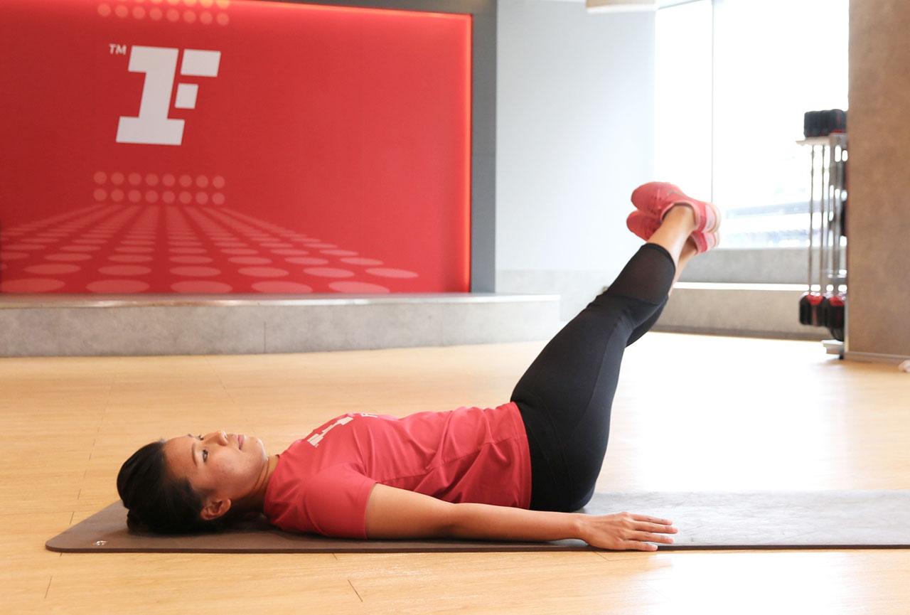 ท่าที่ 1 นอนเตะขา (Lying Leg Lift) เริ่มด้วยการนอนราบกับพื้น ออกแรงจากสะโพกค่อยๆ ยกต้นขาทั้งสองข้างให้ลอยขึ้นจากพื้นโดยไม่งอหลังและเข่า พยายามให้เท้าชี้ขึ้นด้านบนในตำแหน่งสูงสุดที่สามารถจะทำได้ ค้างท่านั้นไว้สักหนึ่งลมหายใจ จึงค่อยๆ ลดขาลงจนเกือบถึงพื้น นับเป็น 1 ครั้ง จากนั้นทำซ้ำต่อไปจนครบ 10 ครั้ง