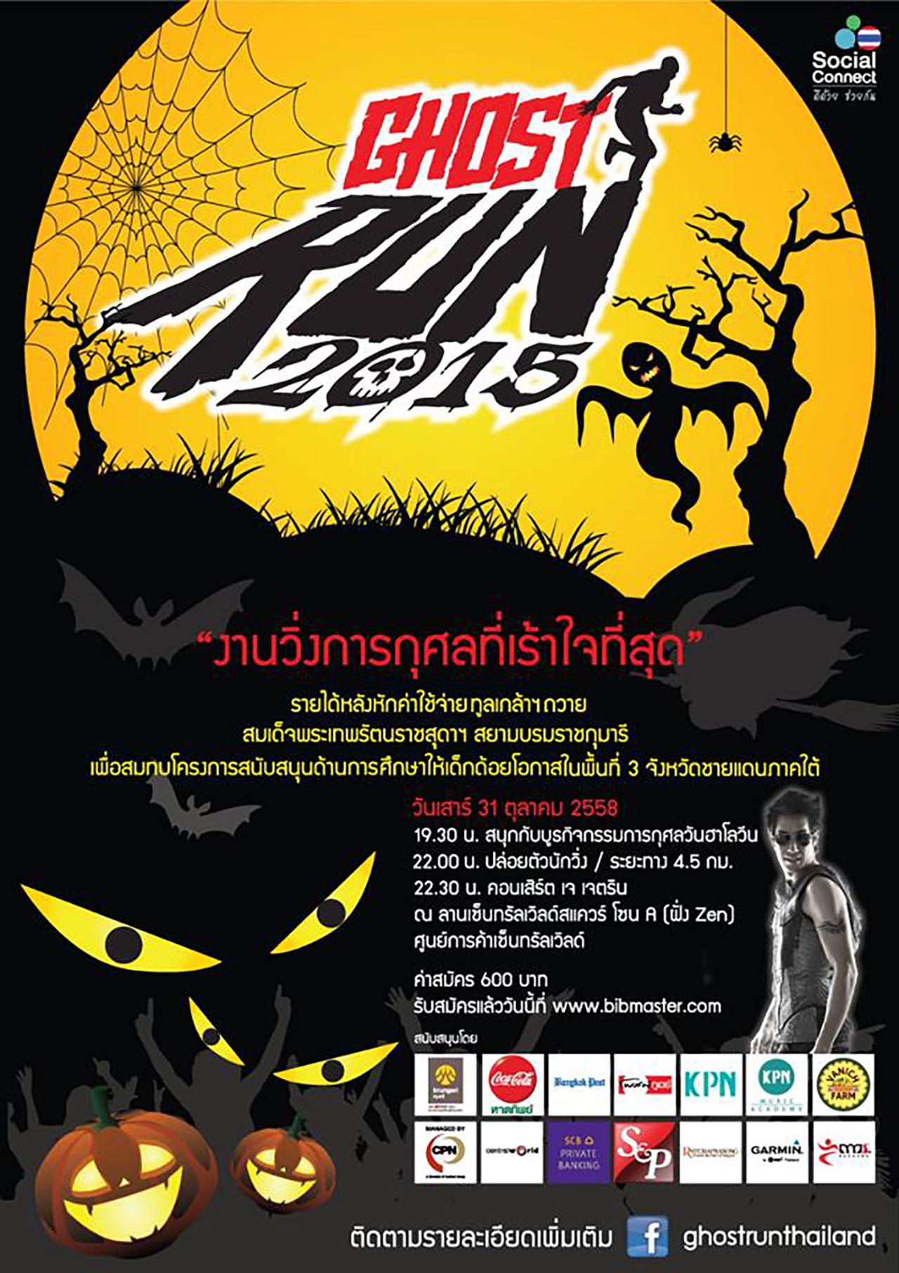 วันที่ 31 ต.ค. 2558 ชวนไปวิ่งในบรรยากาศสุดหลอนในงาน "GHOST RUN 2015" ณ ลานกิจกรรมเซ็นทรัลเวิลด์สแควร์ โซนA (ฝั่งZen) ศูนย์การค้าเซ็นทรัลเวิลด์ งานนี้จะเป็นการวิ่งระยะทาง 4.5 กม. ปล่อยตัวเวลา 22.00 น. หลังเข้าเส้นชัยชมต่อกับคอนเสิร์ตเจ-เจตริน เวลา 23.00 น. ค่าสมัคร 600 บาท รายได้หลังหักค่าใช้จ่ายจะทูลเกล้าฯ ถวายสมเด็จพระเทพรัตนราชสุดาฯ สยามบรมราชกุมารี เพื่อสมทบโครงการสนับสนุนด้านการศึกษาให้เด็กด้อยโอกาสในพื้นที่ 3 จังหวัดชายแดนภาคใต้