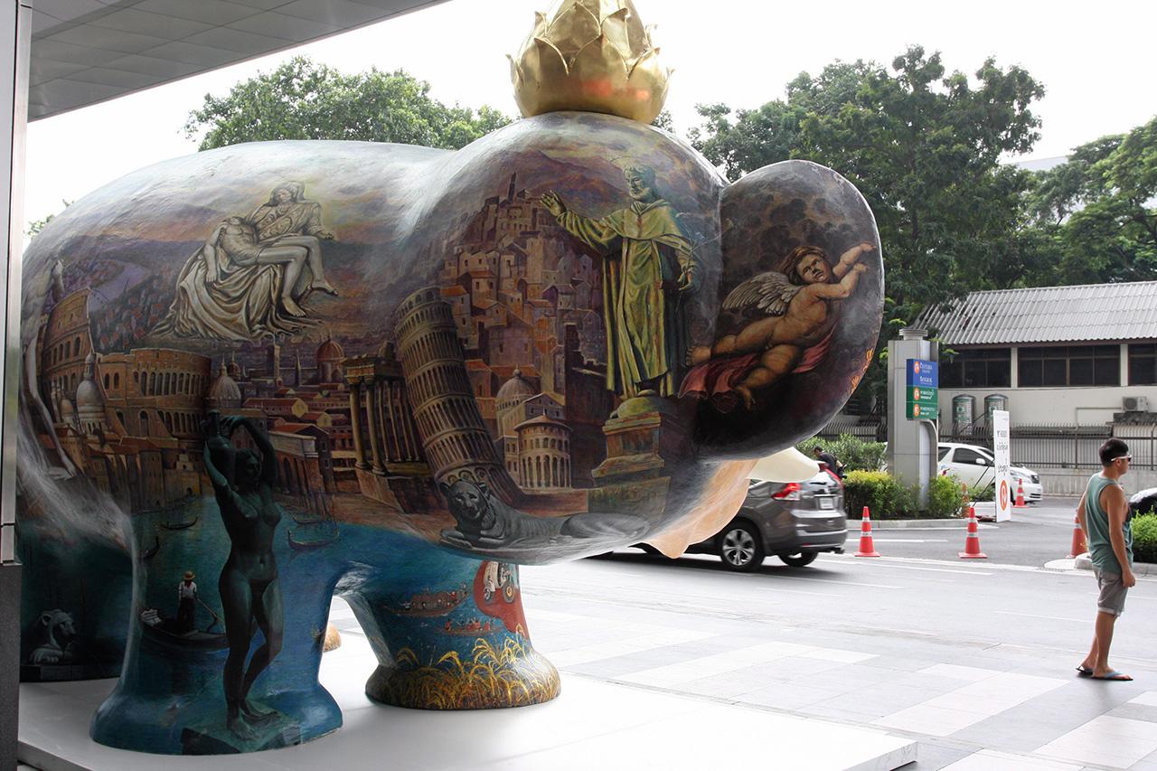 อ.เฉลิมชัย โฆษิตพิพัฒน์ ศิลปินแห่งชาติเมืองเชียงราย โต้โผใหญ่ เล่าถึงผลงานไฮไลต์ ว่าเป็นสัญลักษณ์ของความรักระหว่างประเทศ ไทยและอิตาลี ในคอนเซปต์ “ไทยและอิตาลีเชื่อมโยงกันด้วยผืนฟ้าและผืนน้ำเดียวกัน” ในตัวช้างมีเรื่องราววิถีชีวิตของสองประเทศ ด้านหนึ่งคือประ-เทศไทยที่มีตลาดน้ำ, พระพุทธรูปปางลีลา ผลงานของ อ.ศิลป์ พีระศรี อีกด้านเป็นอิตาลีที่มีคลองเวนิส, ประติมากรรมรูปปั้นเดวิด หัวใจหลักในการเชื่อมโยงสองประเทศ คือ ประวัติศาสตร์ด้านศิลปะตั้งแต่ ร.6 เมื่อครั้ง อ.ศิลป์เข้ามารับราชการในสยามประเทศ ท่านทำประโยชน์จนได้รับการยกย่องให้เป็นบิดาแห่งศิลปะร่วมสมัยของไทย เมื่อช้างตัวนี้ไปตั้งอยู่ที่มิลานจะทำให้คนมิลาน นักท่องเที่ยวจากทั่วโลกรู้จักประเทศไทยมากขึ้น ส่วนชื่อนิทรรศการ “ศิลปะเส้นทางช้างไทย ๙๙๙” ด้วยว่า เลข ๙ ตัวแรกเป็นตัวแทนของศิลปะที่กำเนิดขึ้นในรัชกาลที่เก้า, ๙ ตัวที่สองหมายถึงศิลปินทั้ง ๙๙๙ คน และ ๙ ตัวสุด ท้ายหมายถึงช้างศิลปะทั้ง ๙๙๙ ตัว.