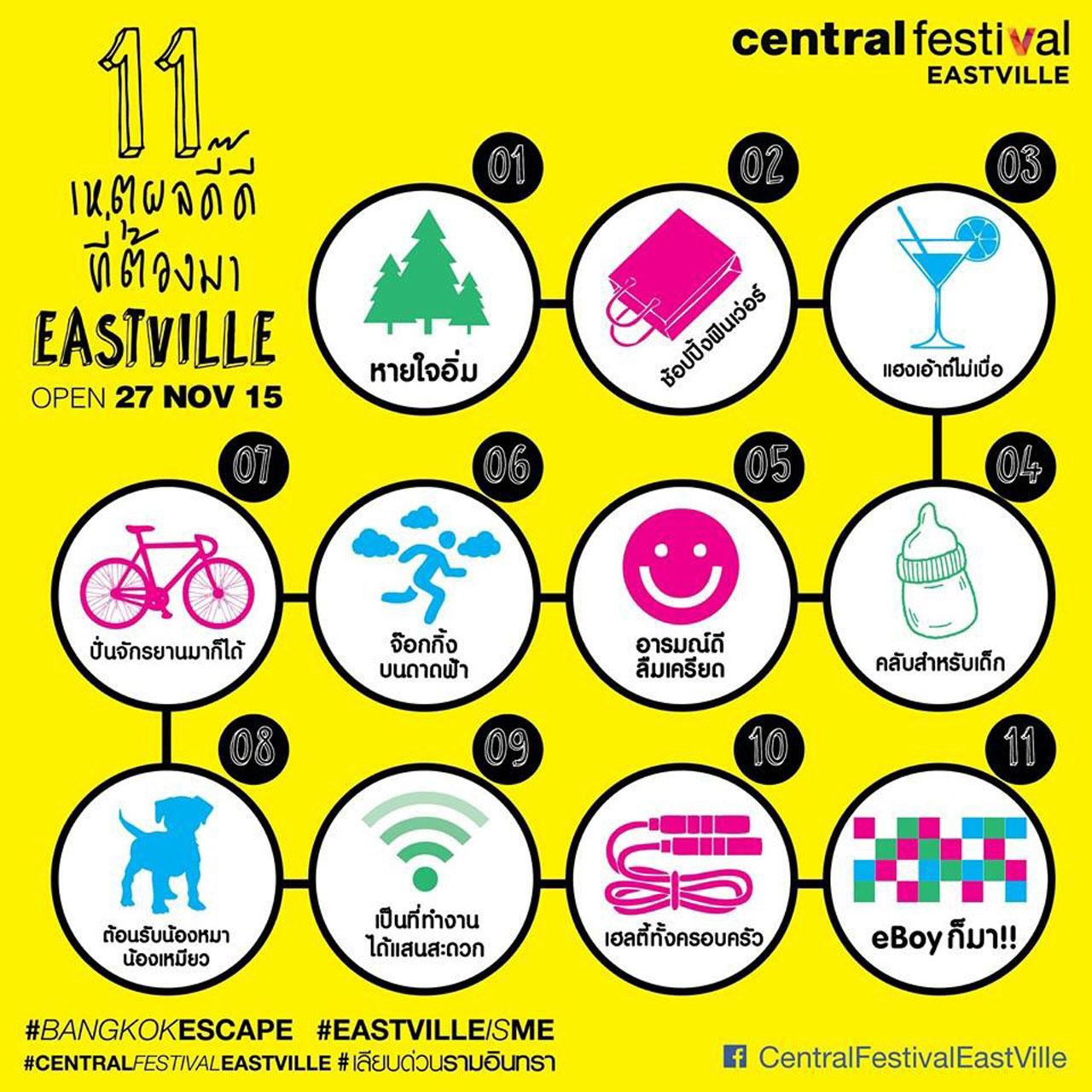 เซ็นทรัลเฟสติวัล อีสต์วิลล์ กำลังจะเปิดให้บริการในวันที่ 27 พ.ย. 2558 นี้ ภายในประกอบไปด้วย โซนห้างเซ็นทรัล, เซ็นทรัลฟู้ดฮอลล์, บีทูเอส, เพาเวอร์บาย, ซูเปอร์สปอร์ต, ออฟฟิศเมท และ โรงภาพยนตร์อีสต์วิลล์ ซีนีเพล็กซ์ ในเครือเมเจอร์ ซีนีเพล็กซ์ กรุ๊ป จำนวน 8 โรงภาพยนตร์ เป็นต้น