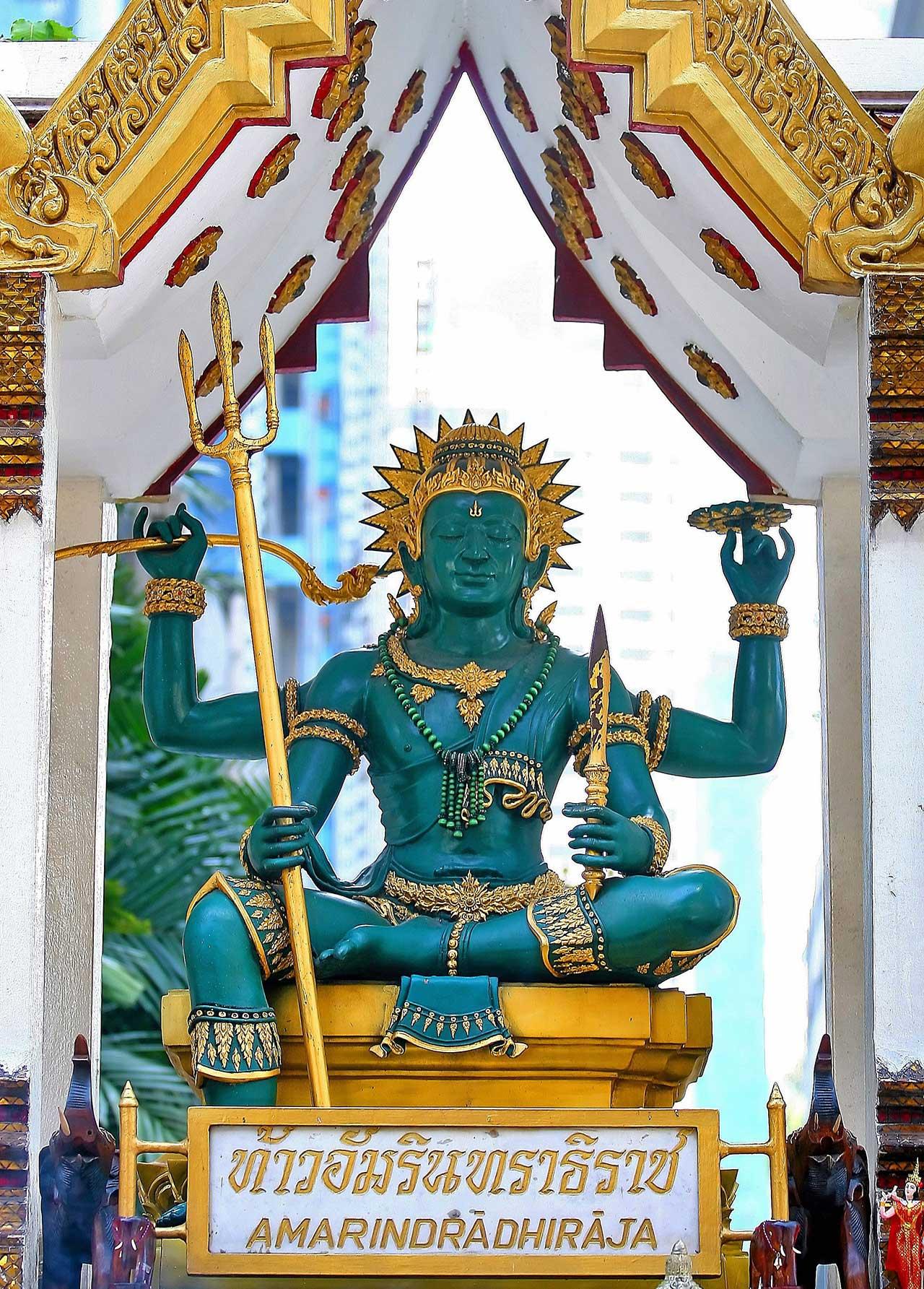 กราบไหว้ท้าวอัมรินทราธิราช ที่ประทับอยู่ด้านหน้าอัมรินทร์ พลาซ่า มีความ เชื่อว่า พระองค์ คือ เทพผู้ผดุงไว้ซึ่งความดี อำนาจของพระองค์จะช่วยปัดเป่าความชั่วร้าย หรือสิ่งไม่ดี ทั้งที่มองเห็นและมองไม่เห็น พร้อมทั้งปกป้องรักษาธุรกิจให้เจริญรุ่งเรือง ท้าวอัมรินทราธิราช ถือเป็นราชาแห่งเทพ ผู้ควบคุมและดลบันดาลปรากฏ-การณ์ธรรมชาติ เครื่องสักการะ : ธูป 9 ดอก เทียน 1 คู่ ดอกดาวเรือง มะพร้าว กล้วยน้ำว้า อ้อย นมสด ตุ๊กตาช้าง หรือม้า