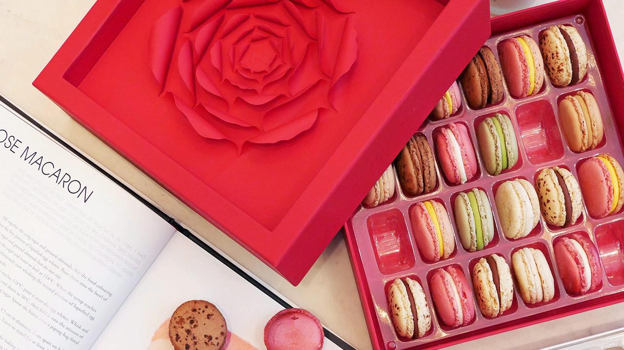 Pierre Herm’e Paris ที่ เอ็มควอเทียร์ จัดกล่องดีไซน์สวยเด่นด้วยกุหลาบอิสปาฮานสีแดง มาบรรจุมาการองอันหอมหวาน เพื่อเป็นของขวัญสุดพิเศษ โทร.0-2200-6444
