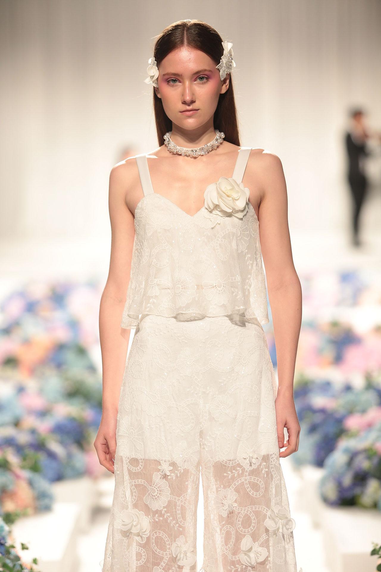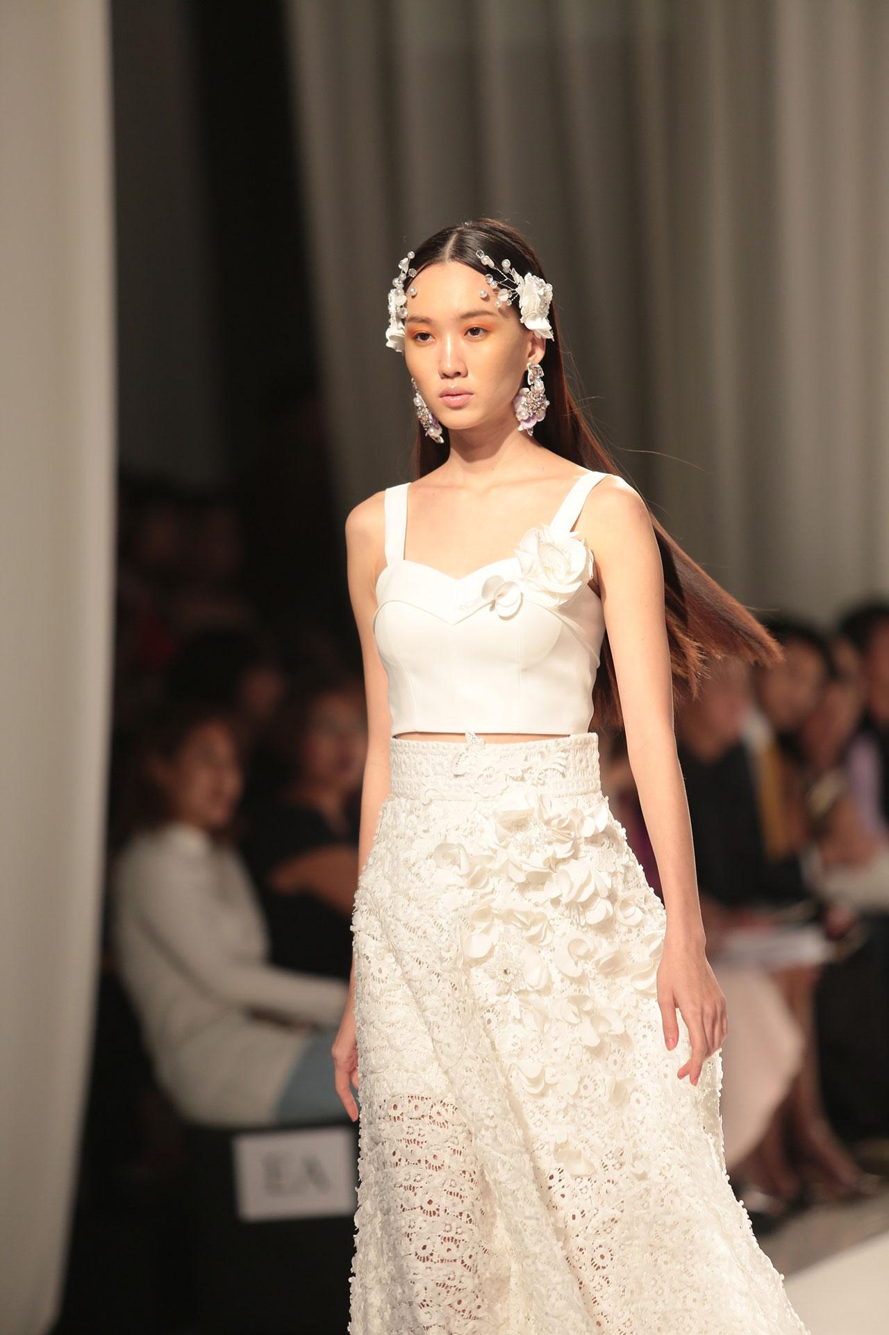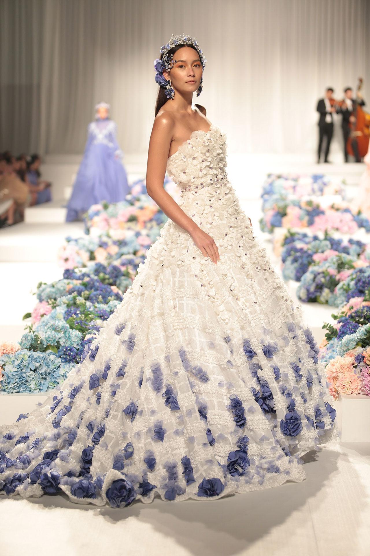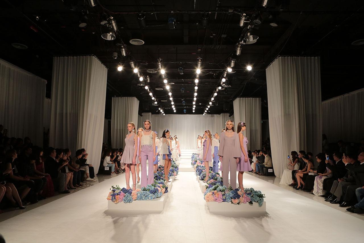 บรรยากาศในแฟชั่นโชว์ อบอวลไปด้วยความหวานของดอกไฮเดรนเยียร์ ที่แข่งกันบานสะพรั่งตั้งแต่ทางเข้า ยาวไปจนถึงรันเวย์ เสียงทรีโอแบรนด์ บรรเลงเพลงเป็นสัญญาณเปิดฉากรันเวย์ ที่เริ่มต้นด้วยความตื่นตา เพลิดเพลินไปกับ 43 โททัลคีย์ลุค ที่ร้อยเรียงมาให้แฟชั่นนิสต้าได้ยลโฉมกันท่ามกลางทุ่งดอกไม้แห่งแสนหวาน โดยไฮไลต์ในคืนนี้ ยกให้ชุดฟินาเล่ สีขาวประดับปักเลื่อมเพิ่มความหรู เปล่งประกายออร่าระยิบระยับ จากงานคราฟท์ปักมือทั้งตัวความยาวกว่า 2 เมตร เรียกเสียงปรบมือส่งท้ายได้อย่างเกรียวกราว สุดประทับใจ