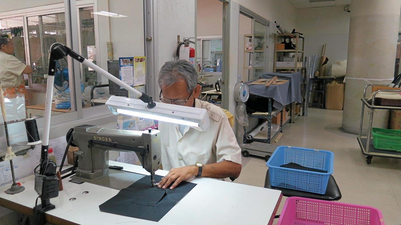 โอกาสนี้ ท่านผู้หญิงพึงใจ สินธวานนท์ รองผู้จัดการมูลนิธิสายใจไทยฯ ได้พาเยี่ยมชม “สายใจไทย บ้านใหม่ทหารผ่านศึก” ที่สำนักสายพัฒนาอาชีพบางนา มูลนิธิสายใจไทยฯ ถนนสรรพาวุธ ซึ่งเป็นสถานที่ผลิตงานฝีมือของสมาชิกมูลนิธิสายใจไทยฯ จำนวนหนึ่ง โดยแบ่งเป็นแผนกๆ ได้แก่ งานเครื่องหนังประกอบกระเป๋า, งานแกะลวดลายบนแก้ว, งานพู่กันระบายสี บนวัสดุต่างๆ, งานไม้, งานตัดเย็บ ซึ่งได้นำผ้าที่ได้รับบริจาค มาตัดเย็บเสื้อผ้า หมอนอิง ของที่ระลึก เป็นต้น โดยท่านผู้หญิงกล่าวว่า ปัจจุบันสมาชิกมูลนิธิสายใจไทยฯ ทั่วประเทศ มีเกือบ 4,000 ครอบครัว โดยเป็นสมาชิกตลอดชีพ มีครอบครัวทหารที่เสียชีวิตหรือได้รับบาดเจ็บ และครอบครัวครูที่เสียชีวิตจาก 3 จังหวัดชายแดนภาคใต้ รวมอยู่ด้วย การติดต่อประสานงาน จะแบ่งเป็นชมรม ทั่วประเทศมีทั้งหมด 38 ชมรม ในการช่วยเหลือขั้นต้น ทีแรกมอบเป็นเงินเดือน แต่ด้วยตัวตราสารของมูลนิธิฯ ที่มุ่งเน้นช่วยเหลือเหล่าทหารหรืออาสาสมัครพิการจากหน้าที่ มีชีวิตอยู่ต่อไปอย่างภาคภูมิ มั่นคง และสามารถช่วยเหลือตัวเองได้ แม้จะพิการ จึงได้มีการฝึกอาชีพ ถ้าสามารถทำการเกษตรได้ ก็ให้การช่วยเหลือด้านเครื่องมือ หรือพืชพันธุ์ บางคนไม่สามารถทำเกษตรได้ ก็ให้เรียนทางวิชาชีพ ในส่วนที่มาทำงานที่สำนักสายพัฒนาอาชีพ บางนานี้ มีเพียงส่วนหนึ่งเท่านั้น นอกจากนี้ยังให้การดูแลเรื่องสุขภาพ ฟื้นฟูสมรรถภาพความพิการ ของเหล่าสมาชิกอีกด้วย