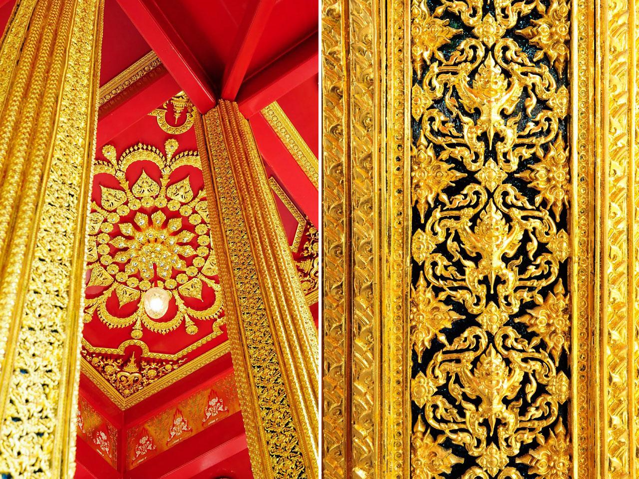 ส่วนตัวเรือนยอด พื้นเรือนชั้นบนปูด้วยหินอ่อนเป็นลายเหลี่ยมเพชร มีเสาย่อมุมทั้งสิ้น 48 ต้น แบ่งเป็นเสาร่วมนอกขนาดย่อม 24 ต้น ตกแต่งด้วยสำริดหล่อลายหงส์ ปิดทองรองซับด้วยกระจกสี และเสาร่วมในขนาดใหญ่ 24 ต้น ตกแต่งด้วยโลหะสำริดหล่อลายครุฑยุดนาคลงรักปิดทอง รองซับด้วยโลหะกระจกสี ระหว่างเสาทำเป็นซุ้มคูหา ตอนบนของซุ้มคูหาเป็นช่องฉลุโปร่งลายราชวัตร ซึ่งทั้ง หมดนี้เป็นโลหะสำริดหล่อปิดทอง ฝ้าเพดานโถงกลางตกแต่งด้วยการจำหลักไม้เป็นอักษรพระนาม “จ.ภ.” ในสมเด็จพระ เจ้าลูกเธอ เจ้าฟ้าจุฬาภรณวลัยลักษณ์ อัครราชกุมารี และที่ฝ้าเพดานโถงมุขทิศตะวันออกและตะวันตก ตกแต่งด้วยการจำหลักไม้เป็นอักษรพระนาม “อ.ร.” ในทูลกระหม่อมหญิงอุบลรัตนราชกัญญา สิริวัฒนาพรรณวดี