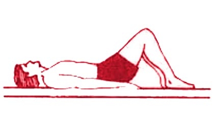 ท่าแรก เริ่มต้นให้นอนหงาย เอาแขนแนบลำตัว ชันเข่าขึ้นให้ต้นขาทำมุมกับพื้นประมาณ 45 องศา จากนั้นให้ยกสะโพกขึ้น ดันขึ้นไปให้สุด ค้างไว้ 10 วินาที แล้วเอาลง…อย่างนี้นับเป็น 1 ยก