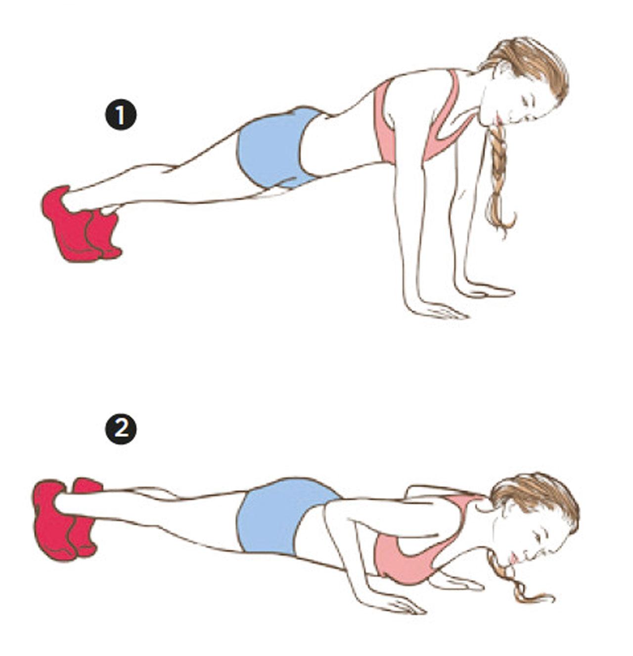 (1.) สองแขนและปลายเท้ายันพื้นอย่างมั่นคง พยายามให้แขนอยู่แนบลำตัวมากที่สุด เหมือนกำลังใช้ศอกหนีบหนังสือ เกร็งแกนกลาง ลดตัวลงให้หน้าอกใกล้พื้นมากที่สุด ไม่เงยหน้า ลำตัวตั้งแต่หัวจดส้นเท้าเป็นแนวตรง