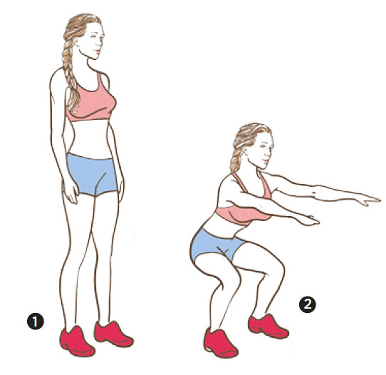 (1.) มือแต่ละข้างถือดัมบ์เบลล์ ยืนแยกขากว้างกว่าช่วงสะโพกเล็กน้อย ย่อตัวดันสะโพกไปด้านหลังจังหวะเดียวกันให้งอเข่า จนบั้นท้ายขนานกับพื้น อย่าก้มหน้า