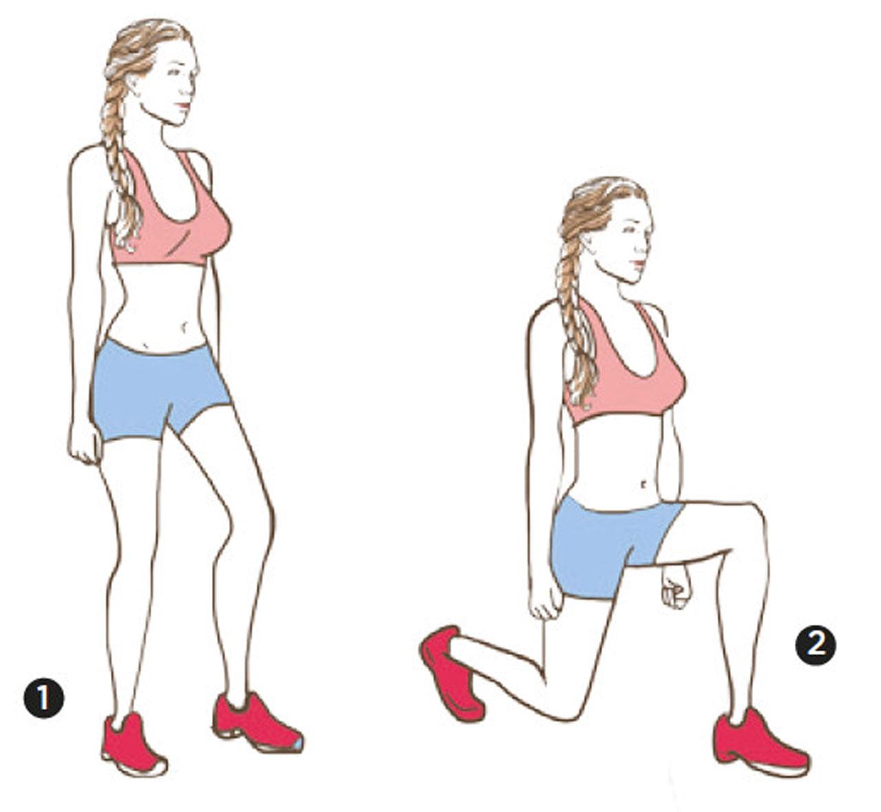 (1.) ยืนแยกขากว้างกว่าสะโพกเล็กน้อย ถอยขาข้างหนึ่งไปด้านหลังพร้อมย่อตัวลงจนต้นขาด้านหน้าขนานกับพื้น พยายามให้ลำตัวตั้งตรง ไม่โยกเยก