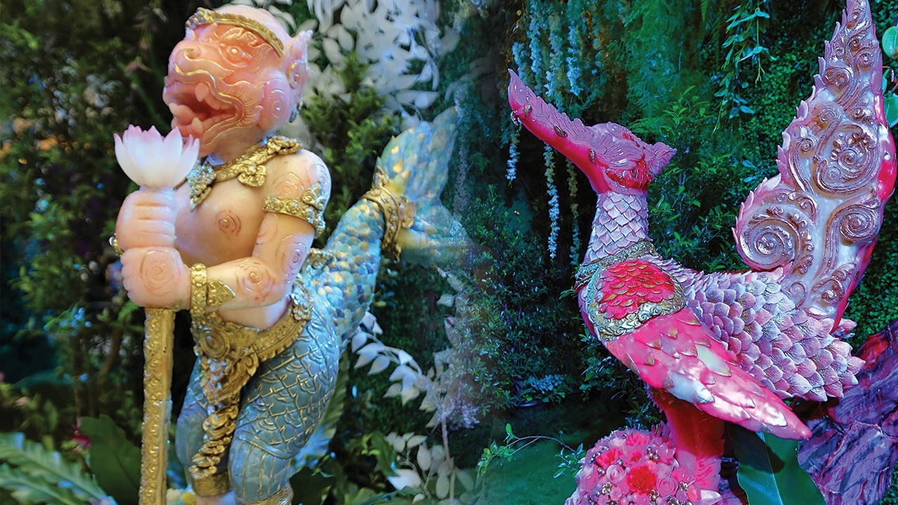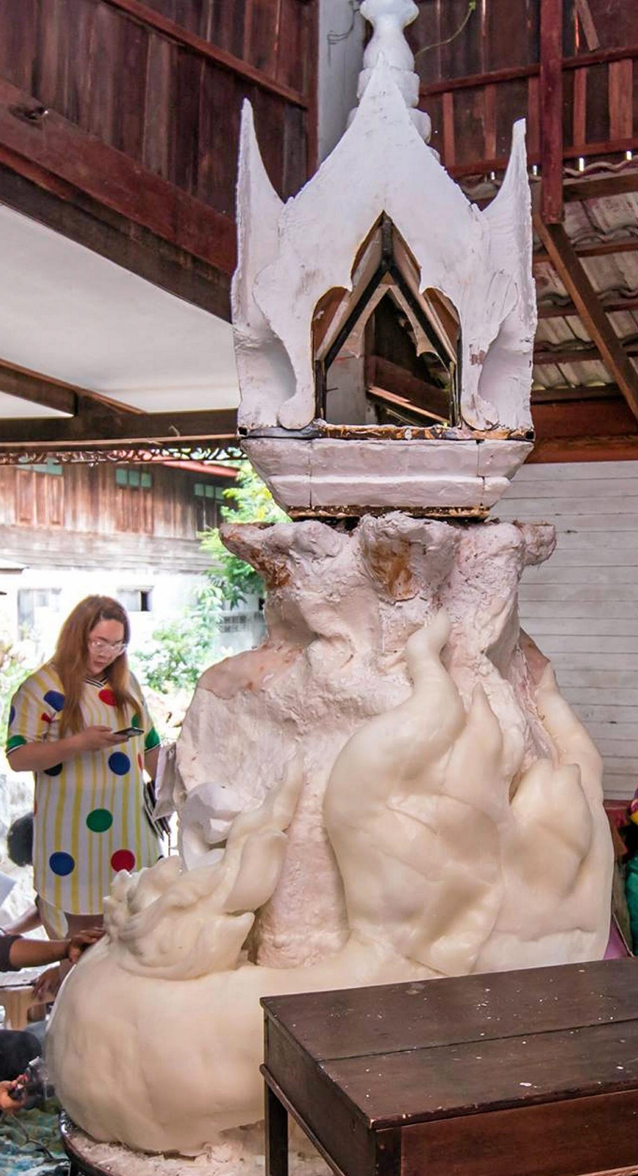ในงานพบกับประติมากรรมเทียนหอม (สีขาว) แกะสลักสุดวิจิตรตระการตา นำเสนอความงดงามของพระอินทร์ ณ เทือกเขาพระสุเมรุ สูง 4 เมตร และเหล่าเทวดา นางฟ้า อีกทั้งปลาอานนท์ ท่ามกลางบรรยากาศของสวนดอกไม้ ภายใต้คอนเซปต์ “ดินแดนสรวงสวรรค์” ผลงานการออกแบบปั้นและแกะสลัก โดยช่างฝีมือศิลปินรุ่นใหม่ ชาลิดา พูลทรัพย์ จากกลุ่มผลิตภัณฑ์เทียนหอมเดชอุดม และคณะนักศึกษาแผนกวิจิตรศิลป์ ชั้นปีที่ 4 วิทยาลัยอาชีวศึกษาอุบลราชธานี พร้อมชมนิทรรศการประวัติความเป็นมาของประเพณีแห่เทียนพรรษา และขั้นตอนการทำเทียน ประเพณีคู่บ้านคู่เมืองของ จ.อุบลราชธานี อีกด้วย.
