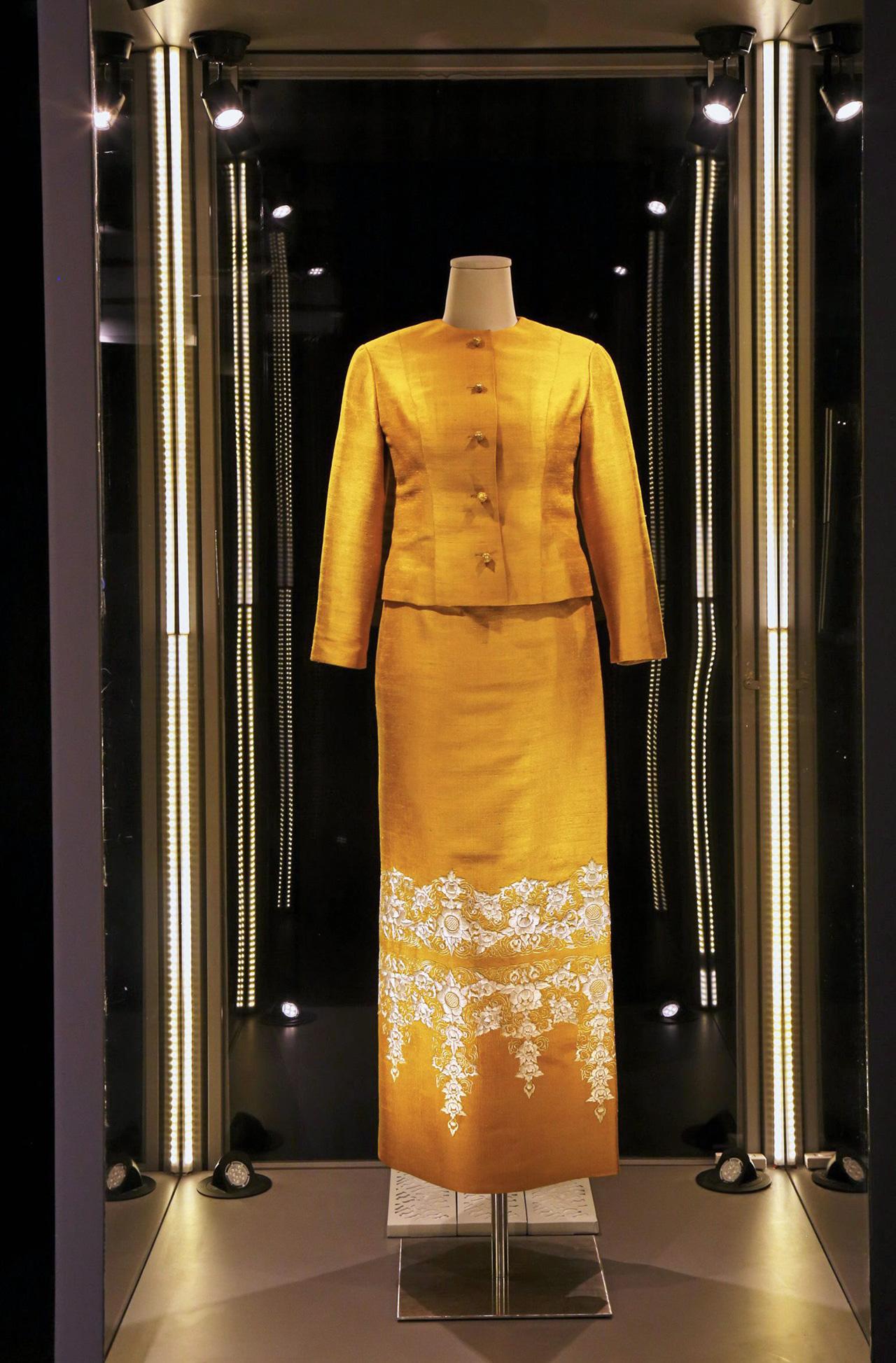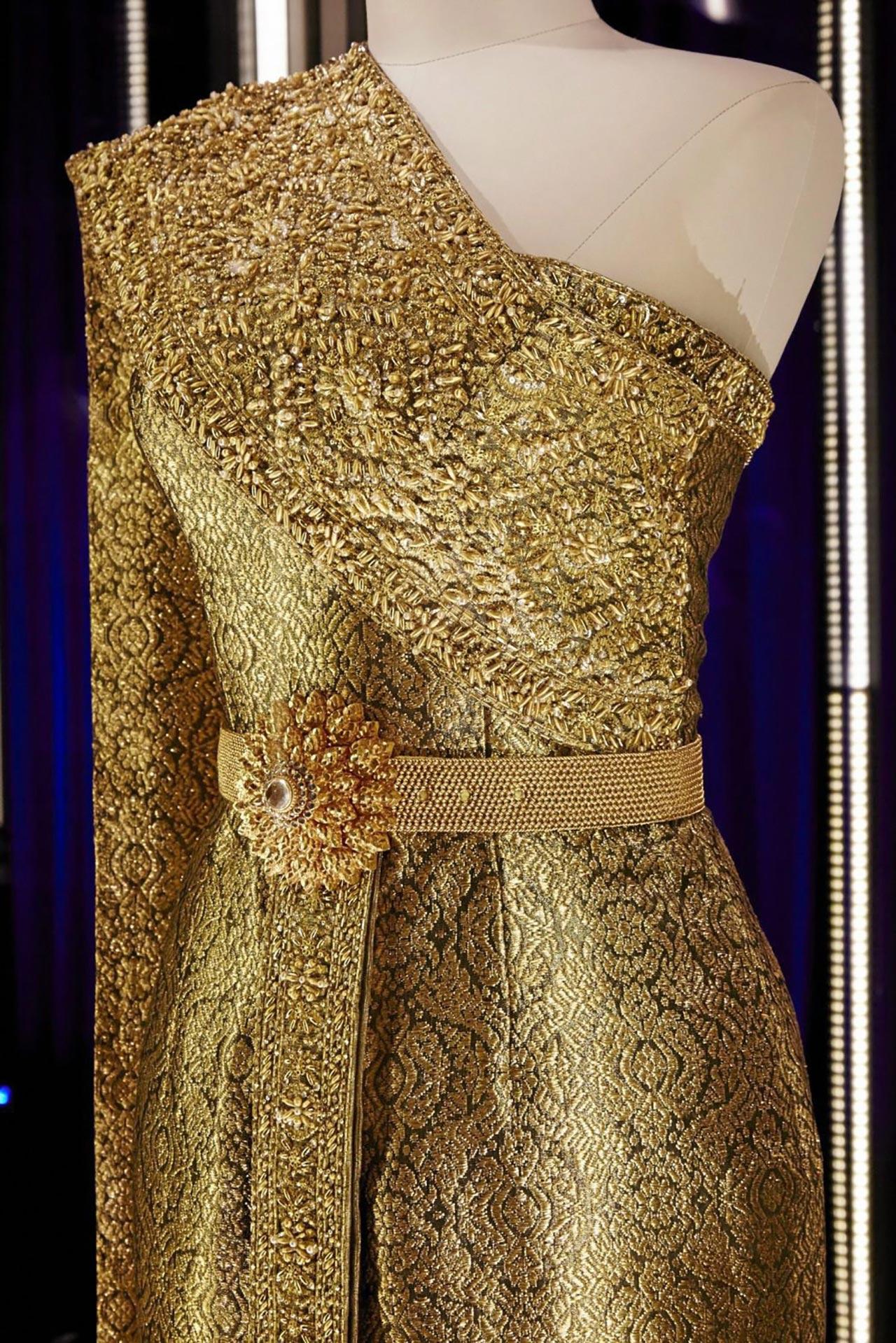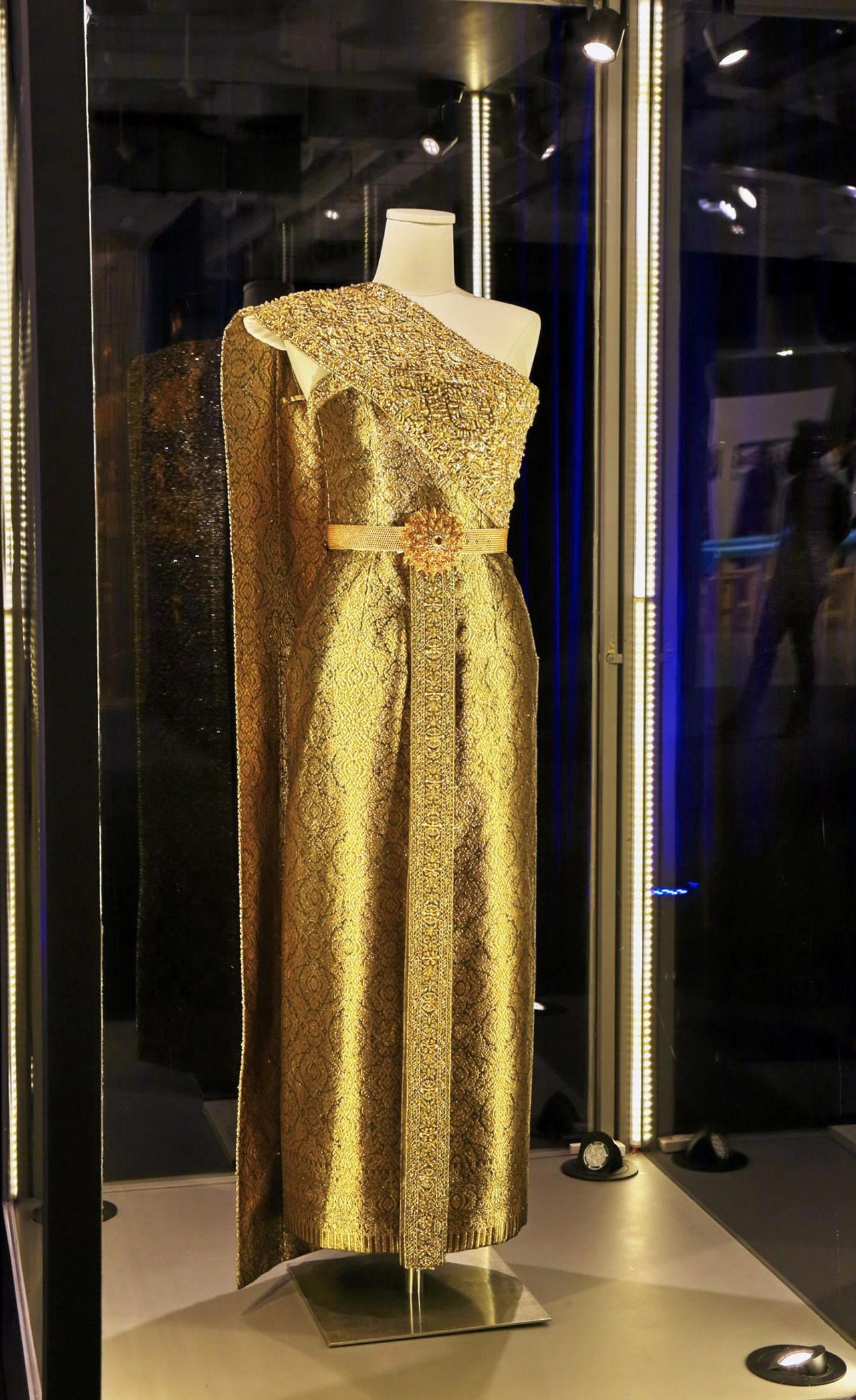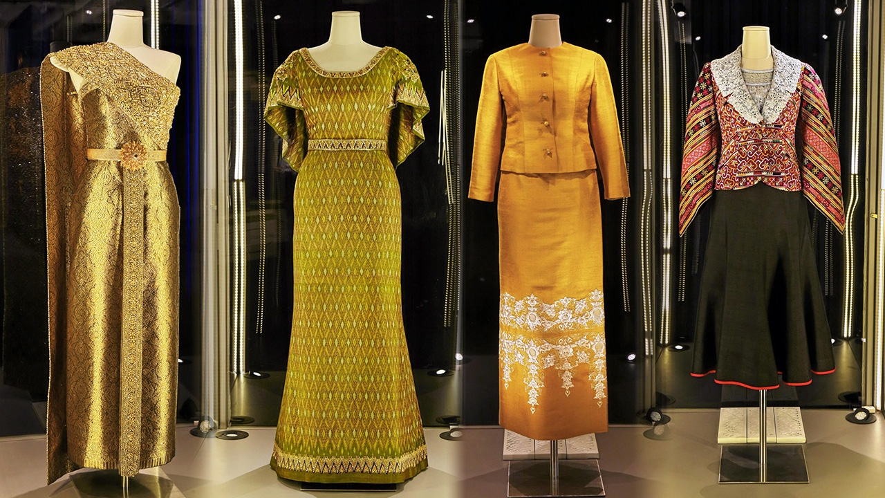 ฉลองพระองค์ที่นำมาจัดแสดง 7 องค์ ได้แก่ ชุดไทยจักรี ที่ทรงในการเสด็จฯไปในงานเลี้ยงอาหารค่ำ ซึ่งสหพันธ์พิทักษ์เด็กจัดขึ้นเนื่องในโอกาสครบรอบ 50 ปีของสหพันธ์ฯ ที่นครนิวยอร์ก สหรัฐอเมริกา เมื่อปี 2524 ฉลองพระองค์นี้ ตัดเย็บจากผ้ายกทองลายโคมพุ่มข้าวบิณฑ์สีทอง ปักประดับบริเวณสไบและจีบหน้าด้วยลูกปัดสีทองและลูกปัดมุก โดยสถาบันปักเลอซาจ สถาบันช่างปักชั้นสูงของประเทศฝรั่งเศส ออกแบบโดย ปิแอร์ บัลแมง นักออกแบบเสื้อผ้าชื่อดังระดับโลก เจ้าของห้องเสื้อ Balmain, ชุดไทยเรือนต้น ออกแบบโดย ห้องเสื้อนายน้อย ตัดเย็บจากผ้าไหมพื้น ปักประดับด้วยเส้นไหม สมเด็จ พระนางเจ้าฯ พระบรมราชินีนาถ ทรงเมื่อครั้งโดยเสด็จพระบาทสมเด็จ พระเจ้าอยู่หัว เสด็จฯไปทรงบำเพ็ญพระราชกุศลถวายผ้าพระกฐิน ณ วัดคูยาง จ.พิษณุโลก ปี 2515, ฉลองพระองค์แบบสากล ตัดเย็บจากผ้าไหมพื้นสีนวล และผ้าฝ้าย ตกแต่งบริเวณปลายแขนและชายพระสนับเพลา ด้วยผ้าปักชาวไทยภูเขา อีกองค์เป็นการตัดเย็บจากผ้าชาวไทยภูเขาเผ่าเย้า ผ้าลูกไม้ และผ้าใยสังเคราะห์ สุดท้าย ตัดเย็บจากผ้าไหมมัดหมี่ ผ้าลูกไม้ ผ้าใยสังเคราะห์ ปักประดับด้วยปีกแมลงทับ ไหมเงิน ไหมทอง เลื่อม และลูกปัด