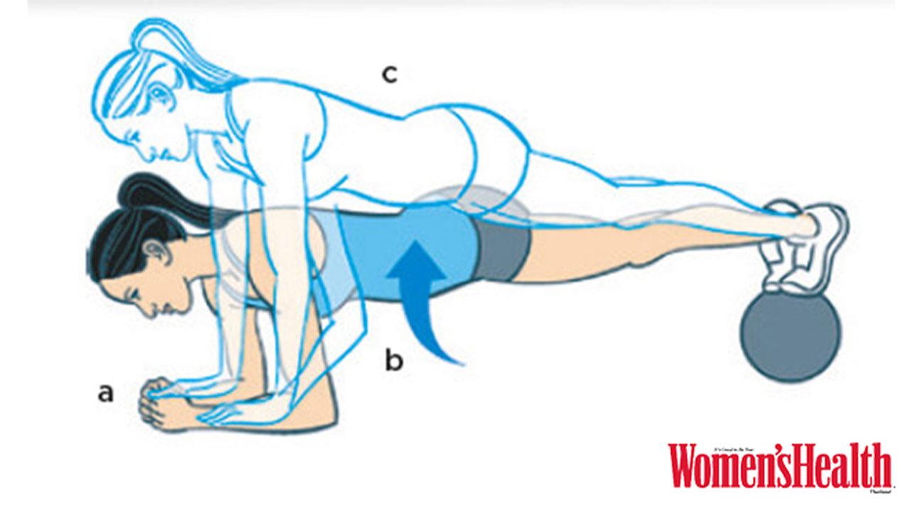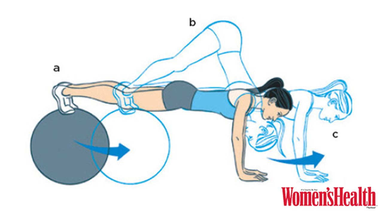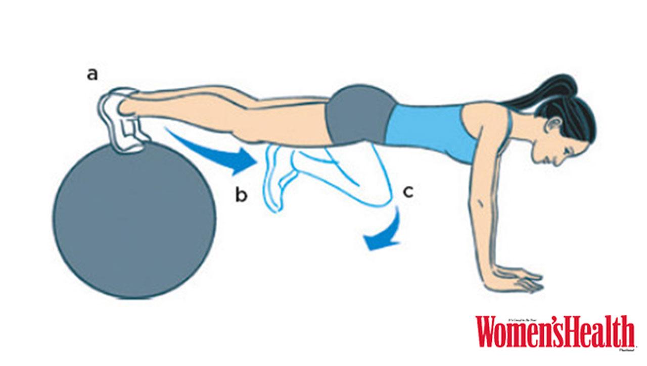 ตั้งท่าวิดพื้นโดยที่เท้าทั้งสองข้างวางบนฟิตบอล a) ยกเท้าซ้ายขึ้นจากบอลแล้วงอเข่าเข้าหาอก อย่าปล่อยให้หลังแอ่น b) จากนั้นบิดสะโพกเพื่อดึงเข่าซ้ายเข้าใกล้ข้อศอกขวามากที่สุด c) ค้างไว้ 1-2 วินาที จึงค่อยๆ กลับสู่ท่าเริ่มต้น นับเป็น 1 ครั้ง ทำ 4 ครั้ง เสร็จแล้วสลับทำอีกข้าง